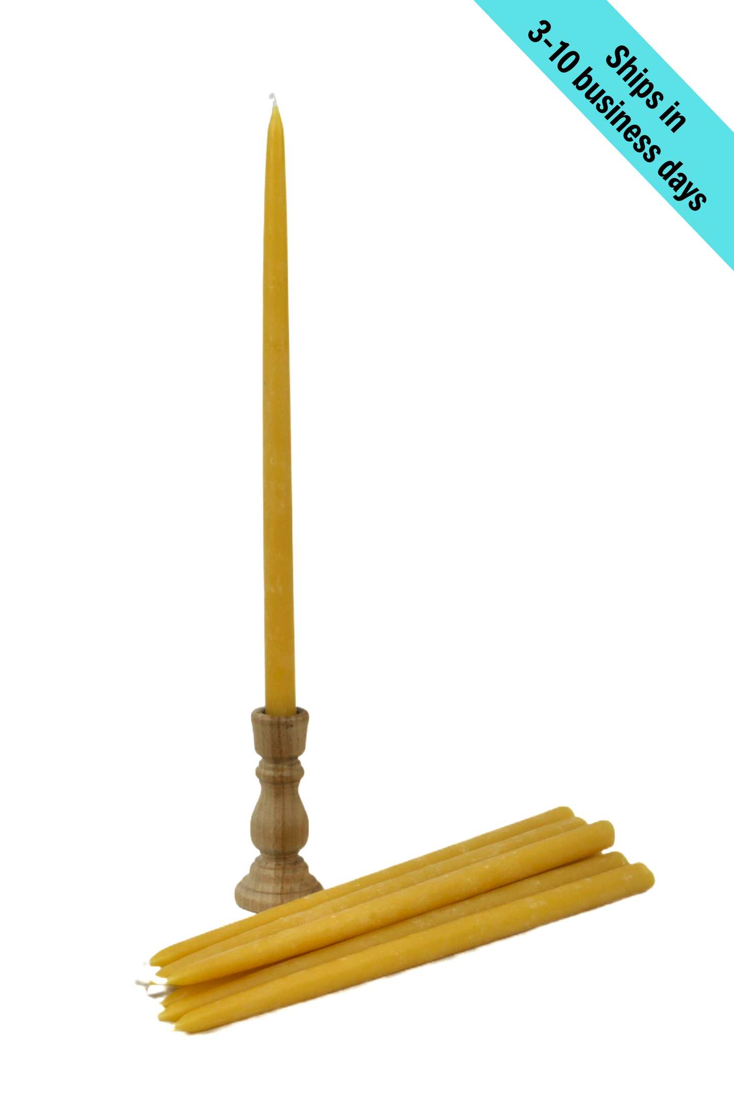 Box of thin tapered 7 1/2”x 3/8 - 13/32" (19 cm x 10mm) candles made from pure beeswax.