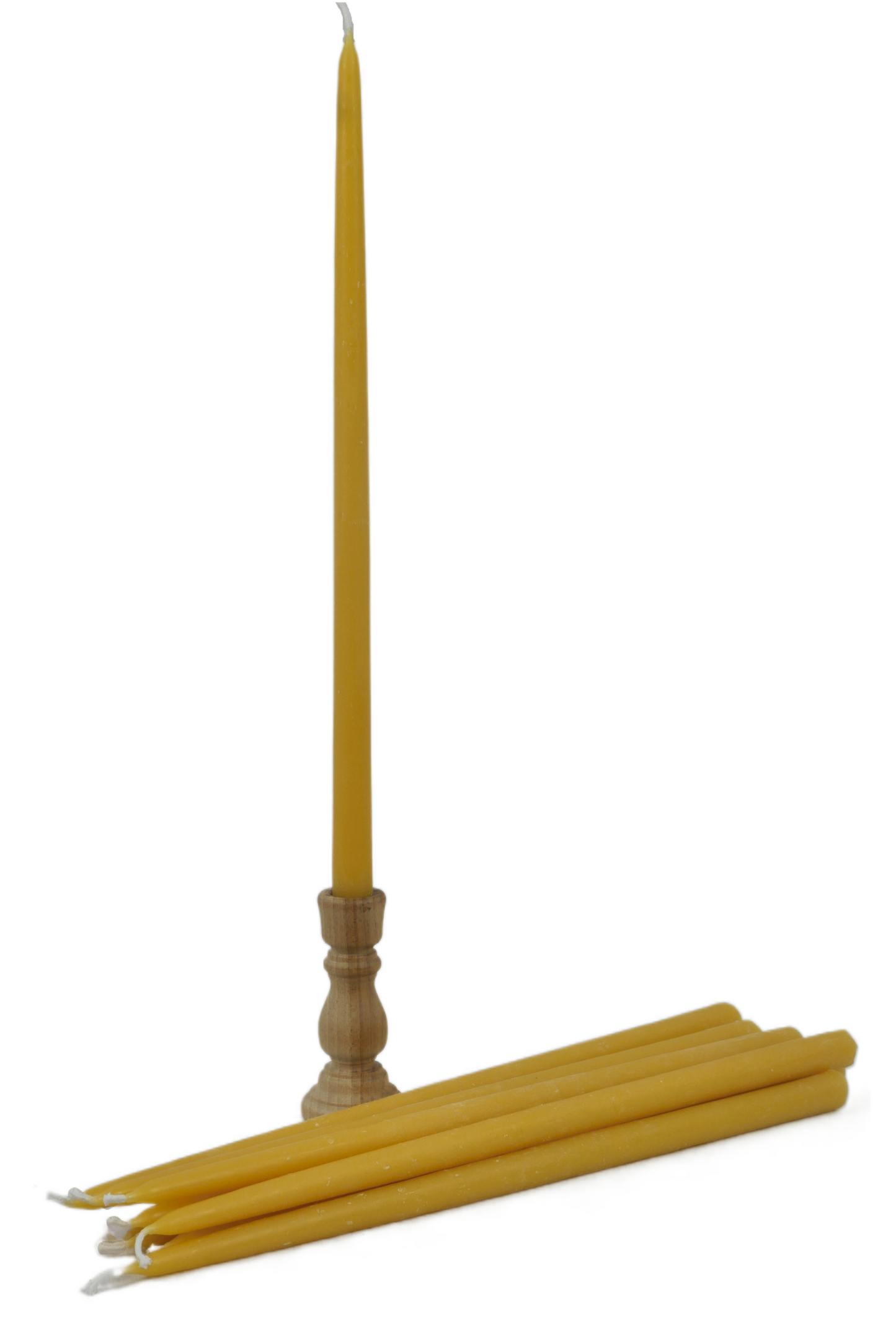 Box of thin tapered 11 1/2"X 1/2" (29cm x 13mm) candles made from pure beeswax.