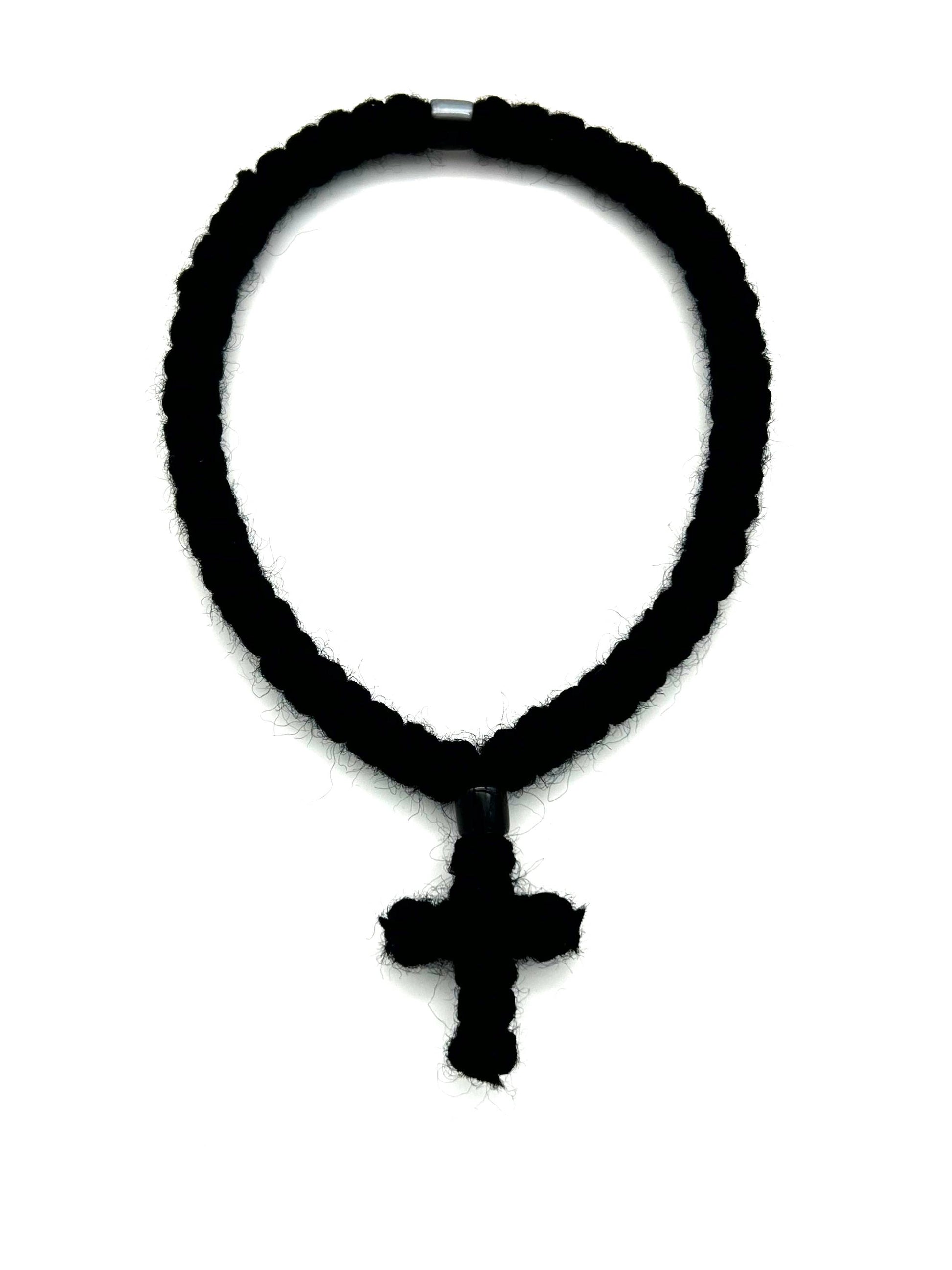 50-knot wool prayer rope in the Greek style for use at home, in church or anywhere. Uses black beads to mark off each 25 knot section (of which there are two).