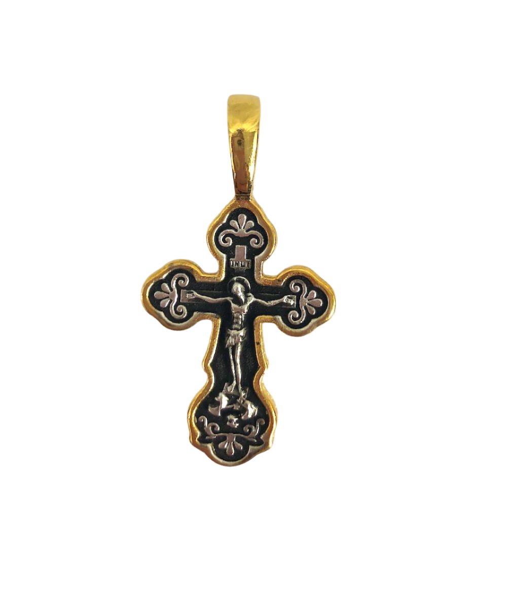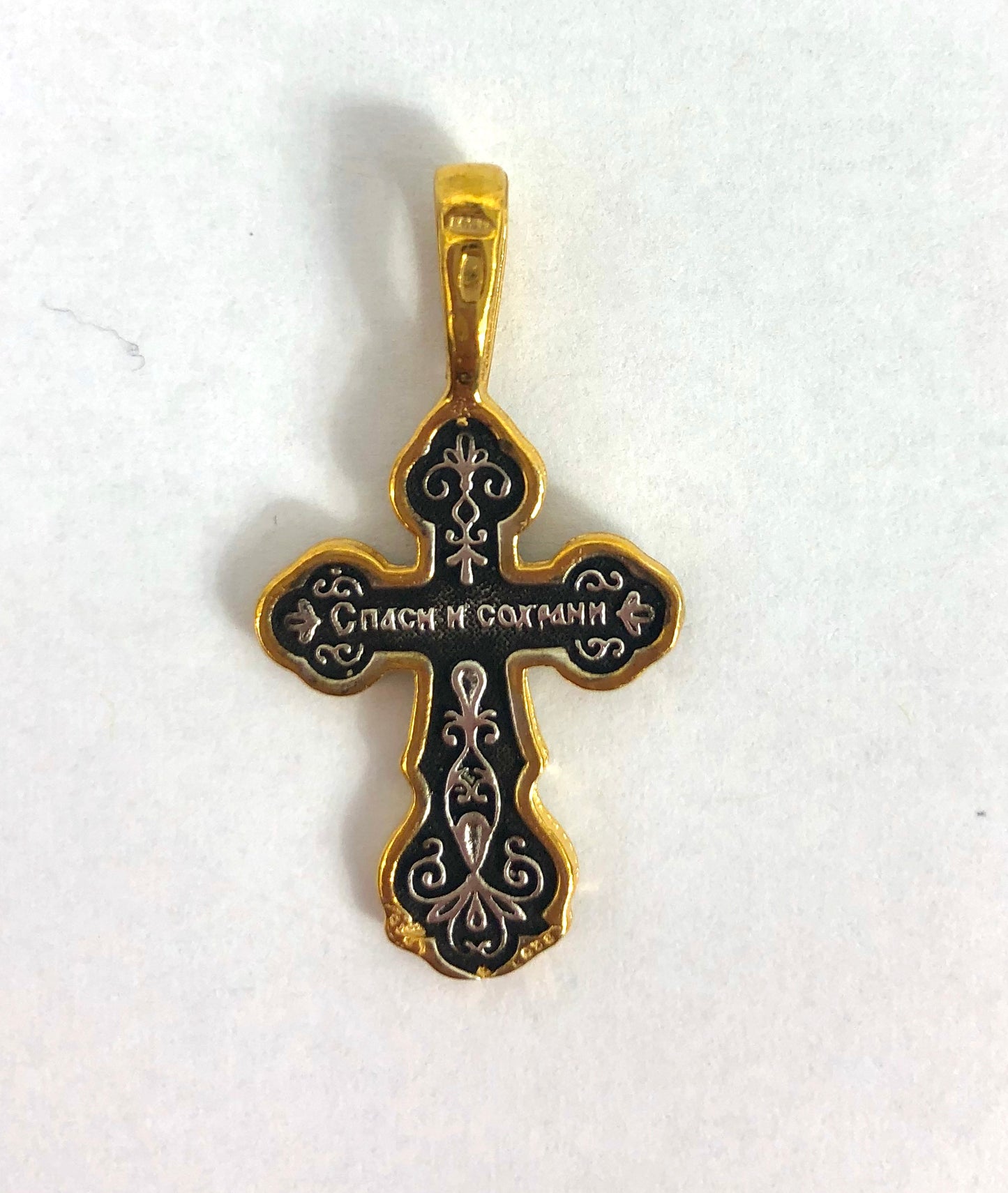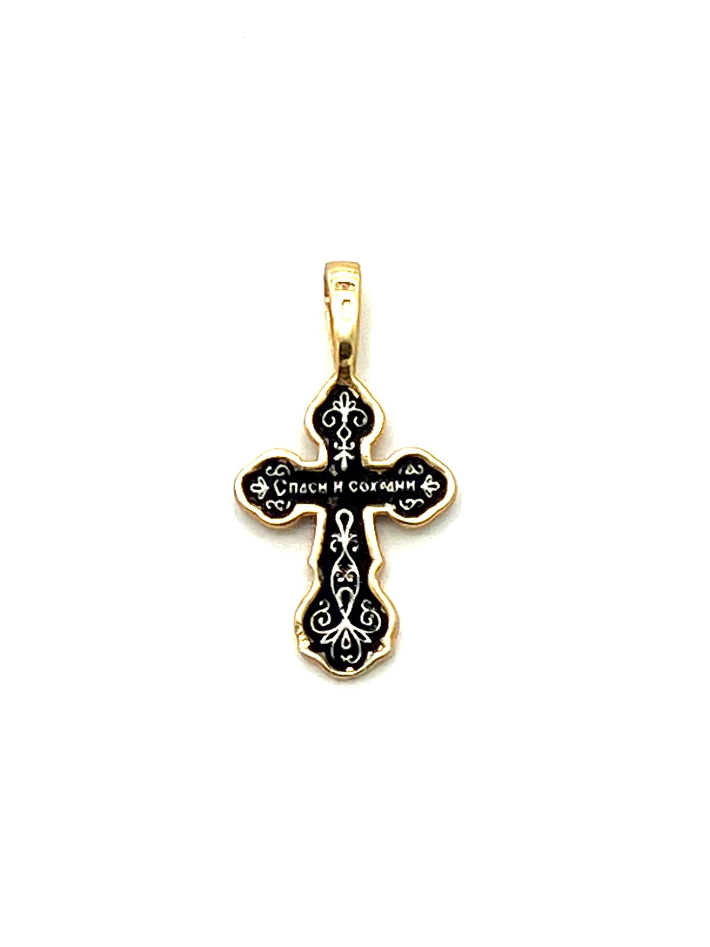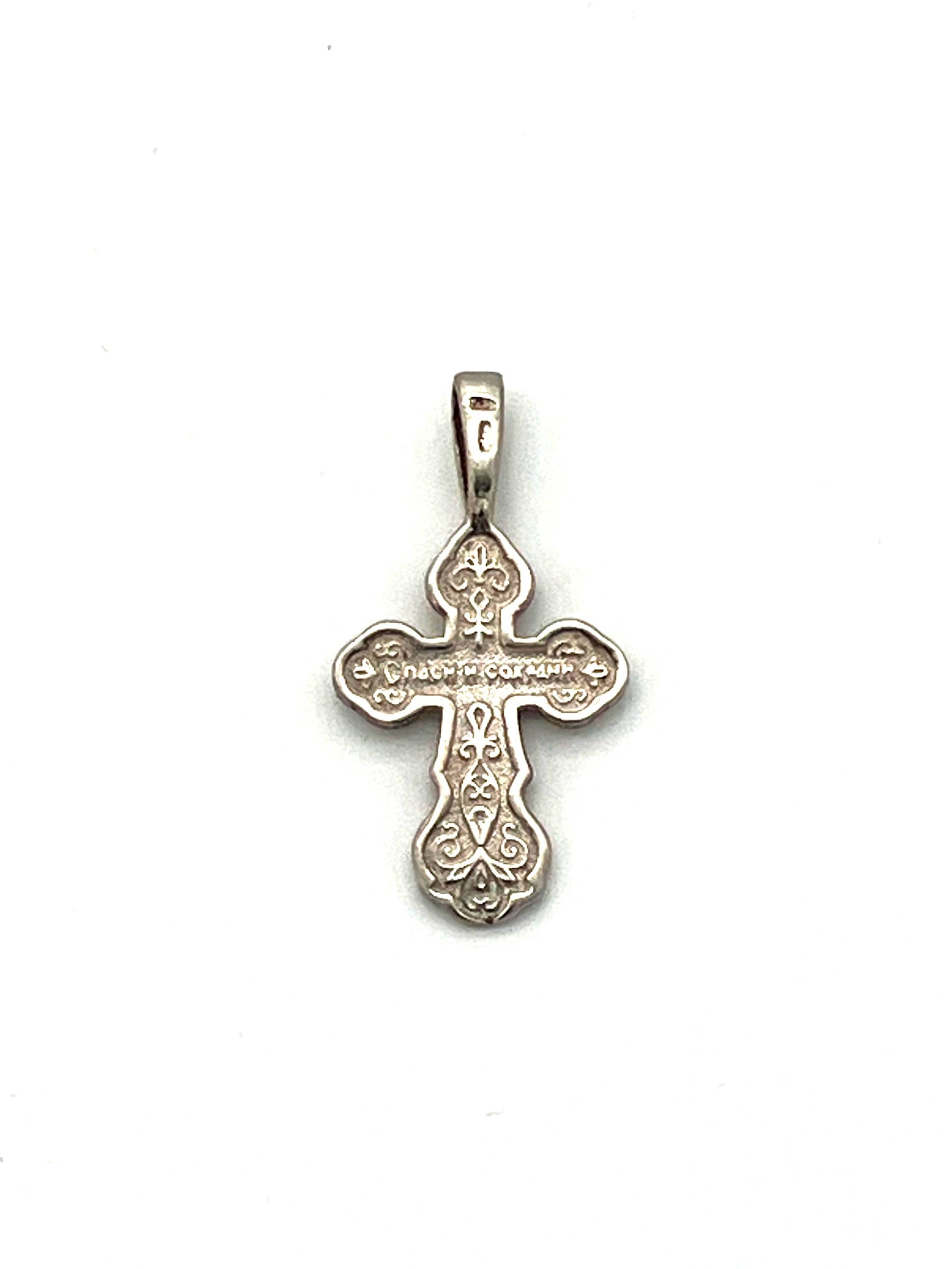 Baptismal crosses (traditionally given on the day of one's baptism) display our faith in Christ and remind us that we have been called to walk "in newness of life." (Romans 6). This sterling silver baptismal cross features a bas-relief metallic icon of the crucifixion of Christ on its face and the Slavonic inscription "спаси и сохрани" (save and keep) on the reverse.