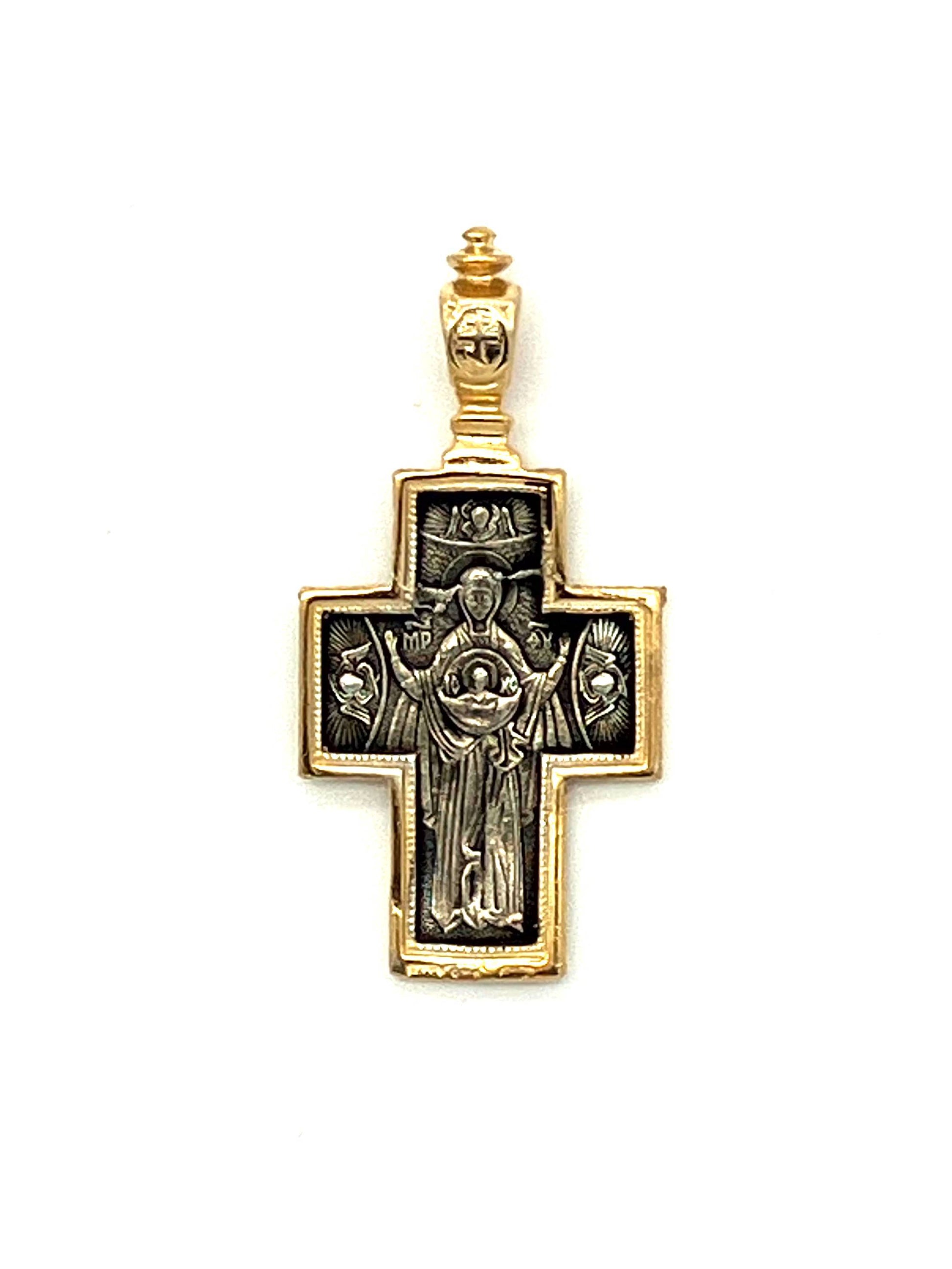Baptismal crosses (traditionally given on the day of one's baptism) display our faith in Christ and remind us that we have been called to walk "in newness of life." (Romans 6). This sterling silver baptismal cross features a bas-relief metallic icon of the crucifixion of Christ on its face and a bas-relief icon of the Theotokos on the reverse.