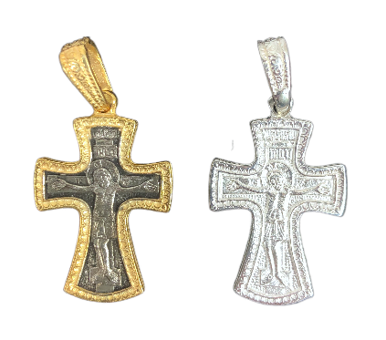 Baptismal crosses (traditionally given on the day of one's baptism) display our faith in Christ and remind us that we have been called to walk "in newness of life." (Romans 6). This sterling silver baptismal cross features a bas-relief metallic icon of the crucifixion of Christ on its face and a smaller bas-relief icon of the Theotokos on the reverse.