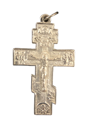 Baptismal crosses (traditionally given on the day of one's baptism) display our faith in Christ and remind us that we have been called to walk "in newness of life." (Romans 6). This sterling silver baptismal cross features a bas-relief metallic icon of the crucifixion of Christ on its face and a Slavonic inscription on the reverse.