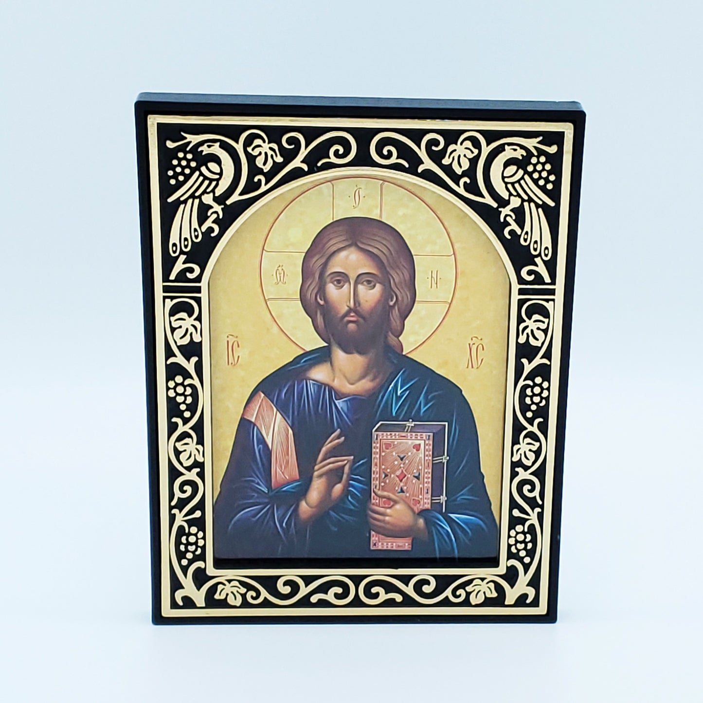 This beautifully crafted wall icon features an original Jordanville icon design of Christ, faithfully reproduced with rich detail and vibrant colors. Handcrafted in Greece, the icon is mounted on a sturdy ½-inch thick wooden backing and framed with an elegant ornamental border adorned with intricate scrollwork and grapevine motifs. A secure D-ring clasp on the back allows for easy hanging, making it a perfect addition to any home.