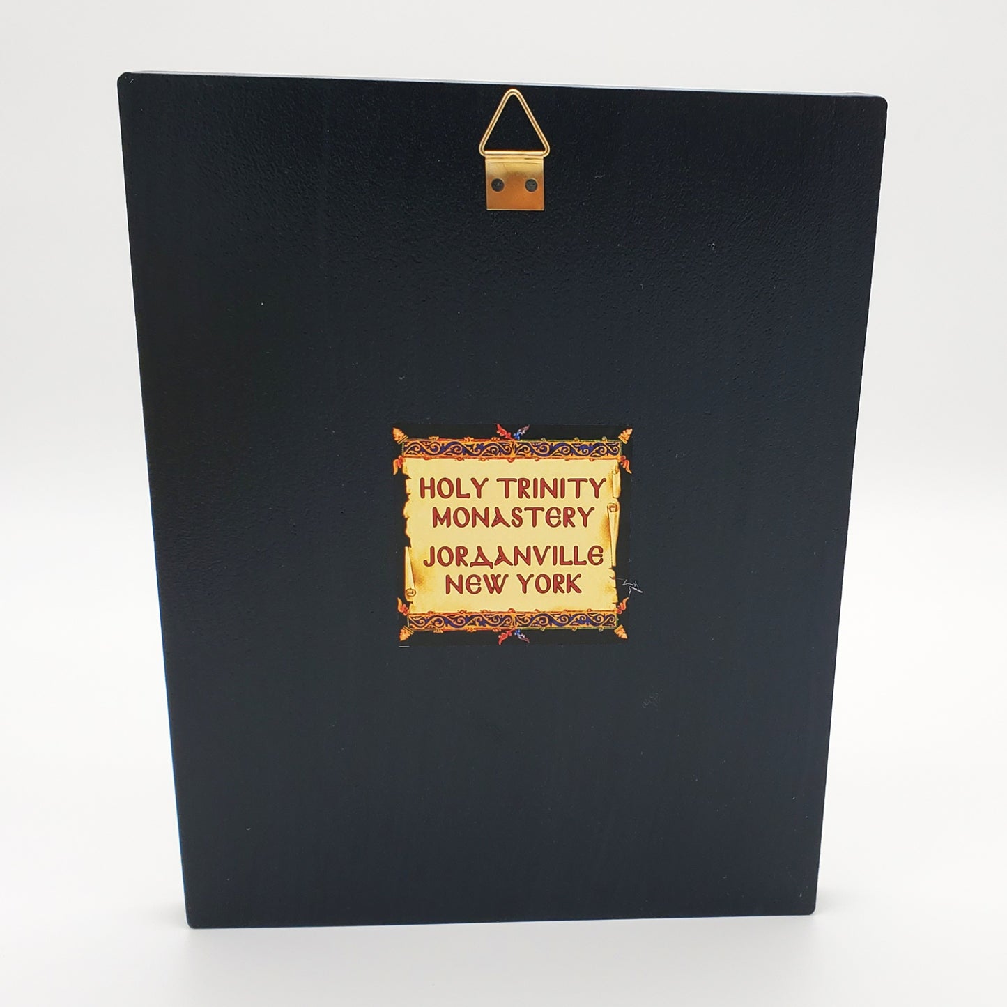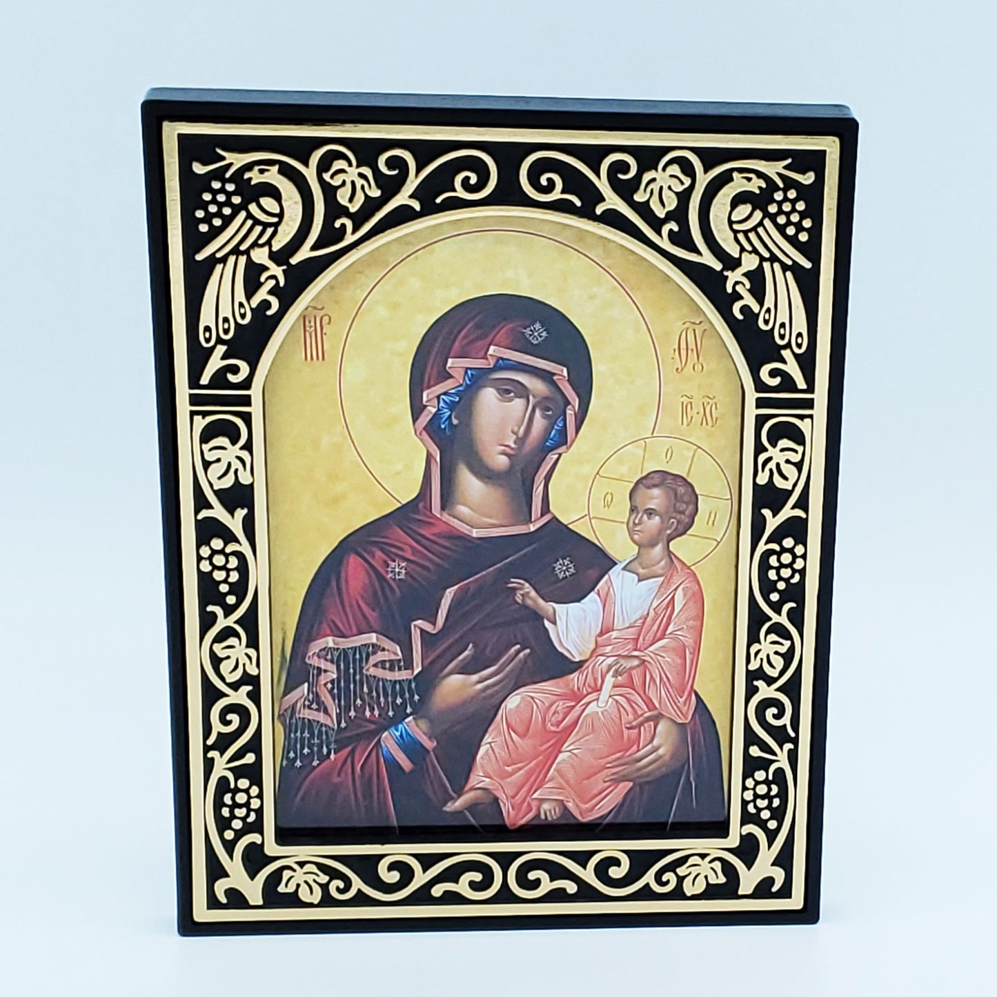 This beautifully crafted wall icon features an original Jordanville icon design of the Theotokos, faithfully reproduced with rich detail and vibrant colors. Handcrafted in Greece, the icon is mounted on a sturdy ½-inch thick wooden backing and framed with an elegant ornamental border adorned with intricate scrollwork and grapevine motifs. A secure D-ring clasp on the back allows for easy hanging, making it a perfect addition to any home.