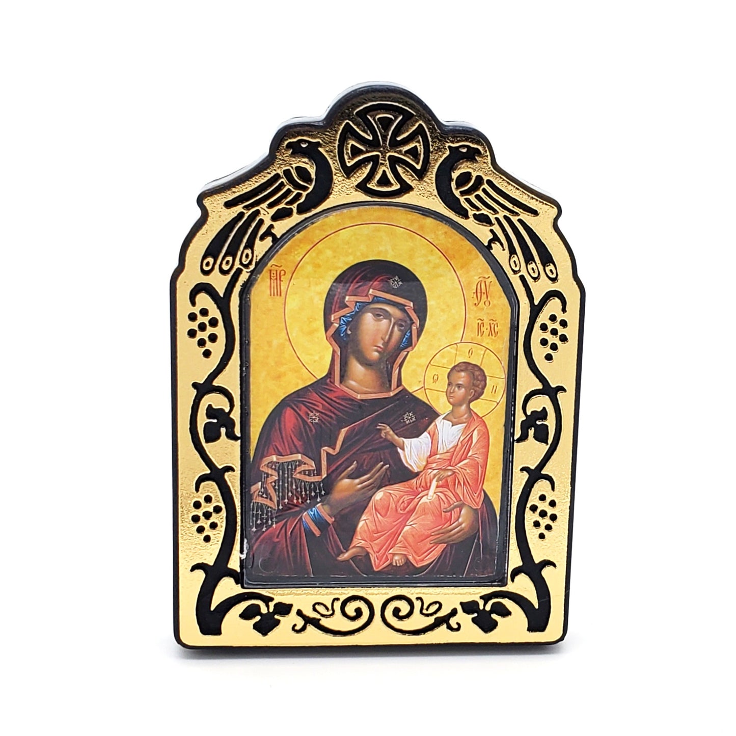 This beautifully crafted desktop and wall icon features an original Jordanville icon design of the Theotokos, faithfully reproduced with rich detail and vibrant colors. Handcrafted in Greece, the icon is mounted on a sturdy 5/8-inch thick wooden backing and framed with an elegant ornamental border adorned with grapevine motifs. This icon can be used as a desktop icon (with the peg stand attachment) or as a wall icon (with the nail hole at the top).