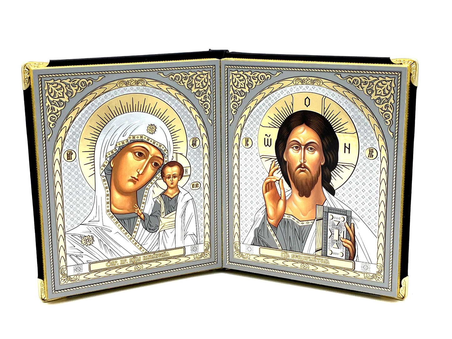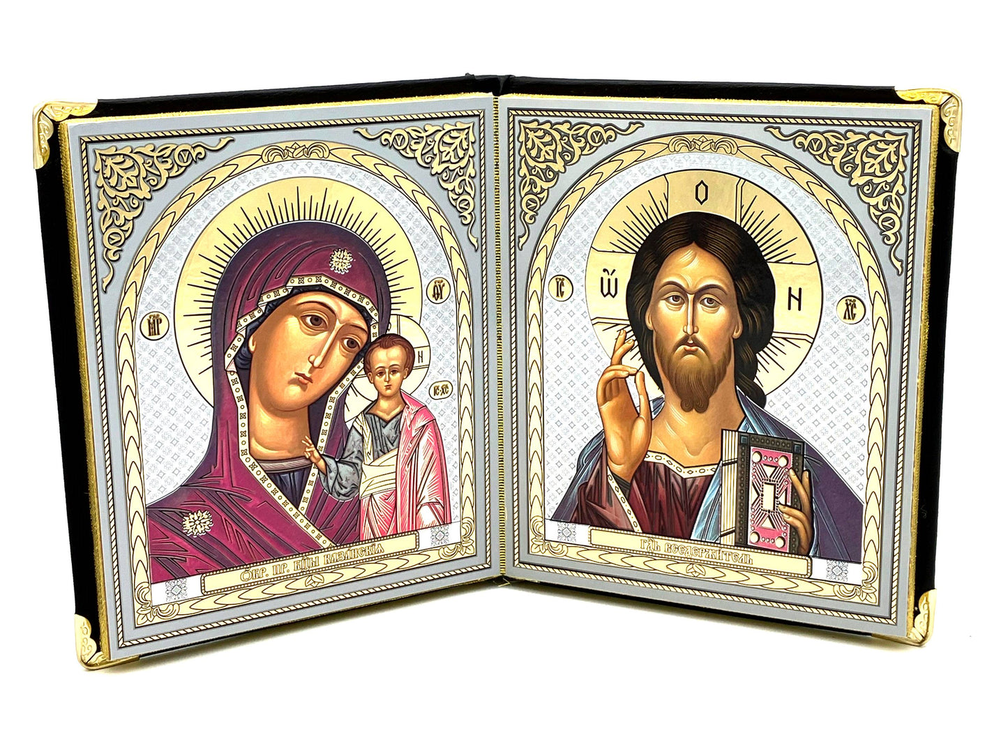Diptych icons have long been used to facilitate prayer and mediation while traveling or otherwise away from one's usual place of prayer. This diptych of the Lord Jesus Christ and the Mother of God comes in two varieties, one in which their garments are red and blue and one in which their garments are silver. It is also bound in a soft case with an icon of the Cross on the front.