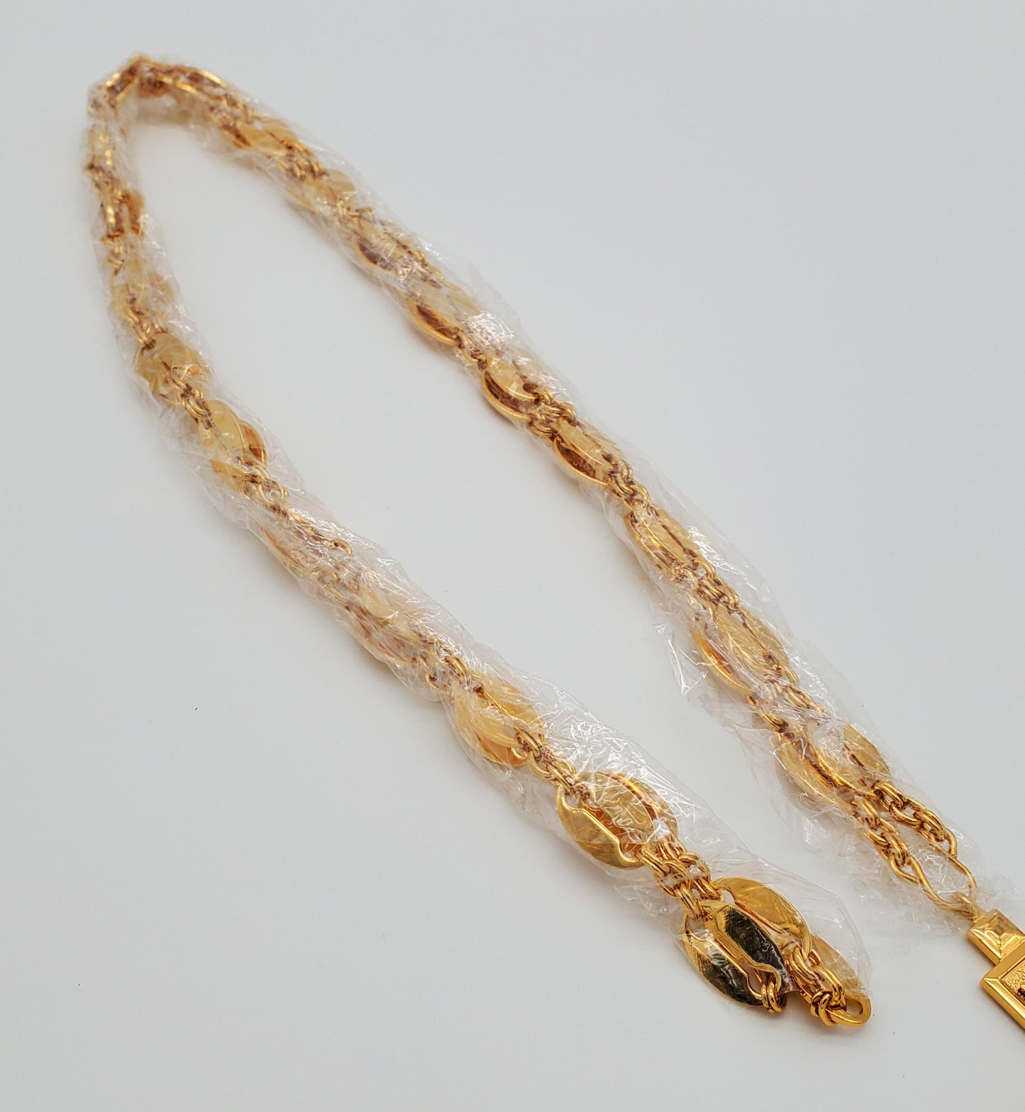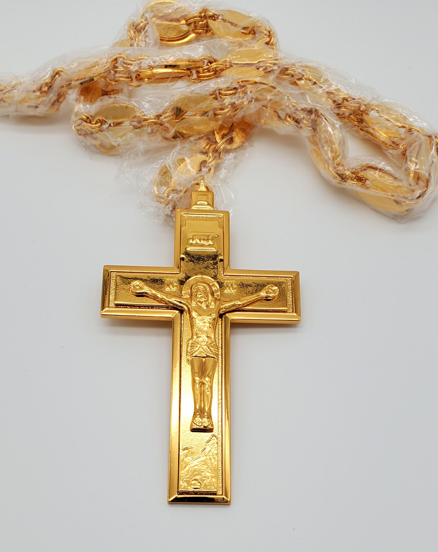 Golden pectoral crosses are worn by archpriests, abbots and abbesses as a mark of their office, and may be awarded to other priests for distinguished service to the church. This pectoral cross is gold plated and hangs on a golden chain. It is also inscribed on the reverse side with the words: "пресвѵтеру дающему образъ вѣрнымъ словомъ и житіемъ."