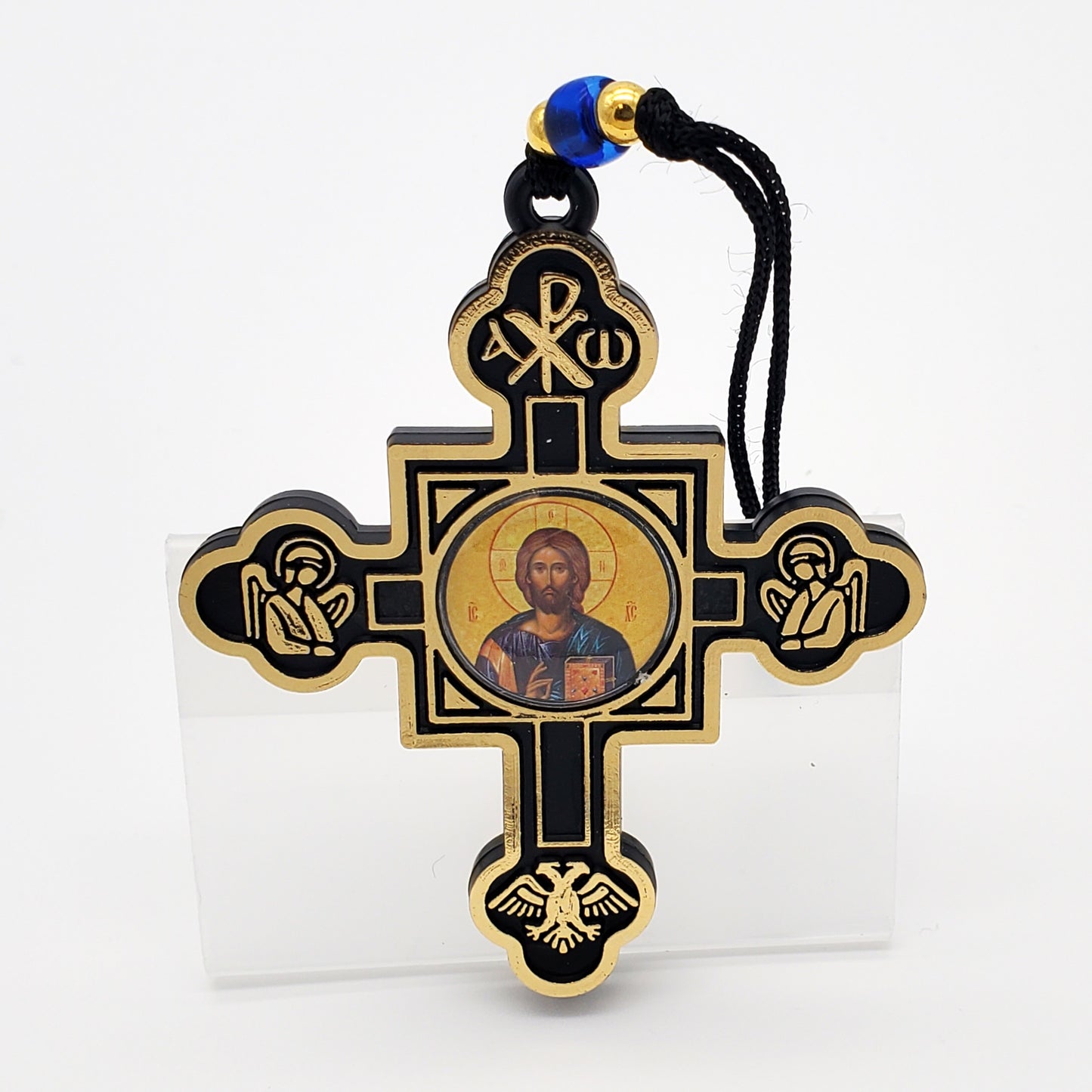 This beautifully crafted double-sided Byzantine cross features an original Jordanville medallion icon of Christ on one side and the Theotokos on the other. Handcrafted in Greece, the icons are mounted on a decorated plastic cross frame that features gold highlights on a dark background. Attached to the top of the cross is a 4-inch long braided loop cord for hanging.