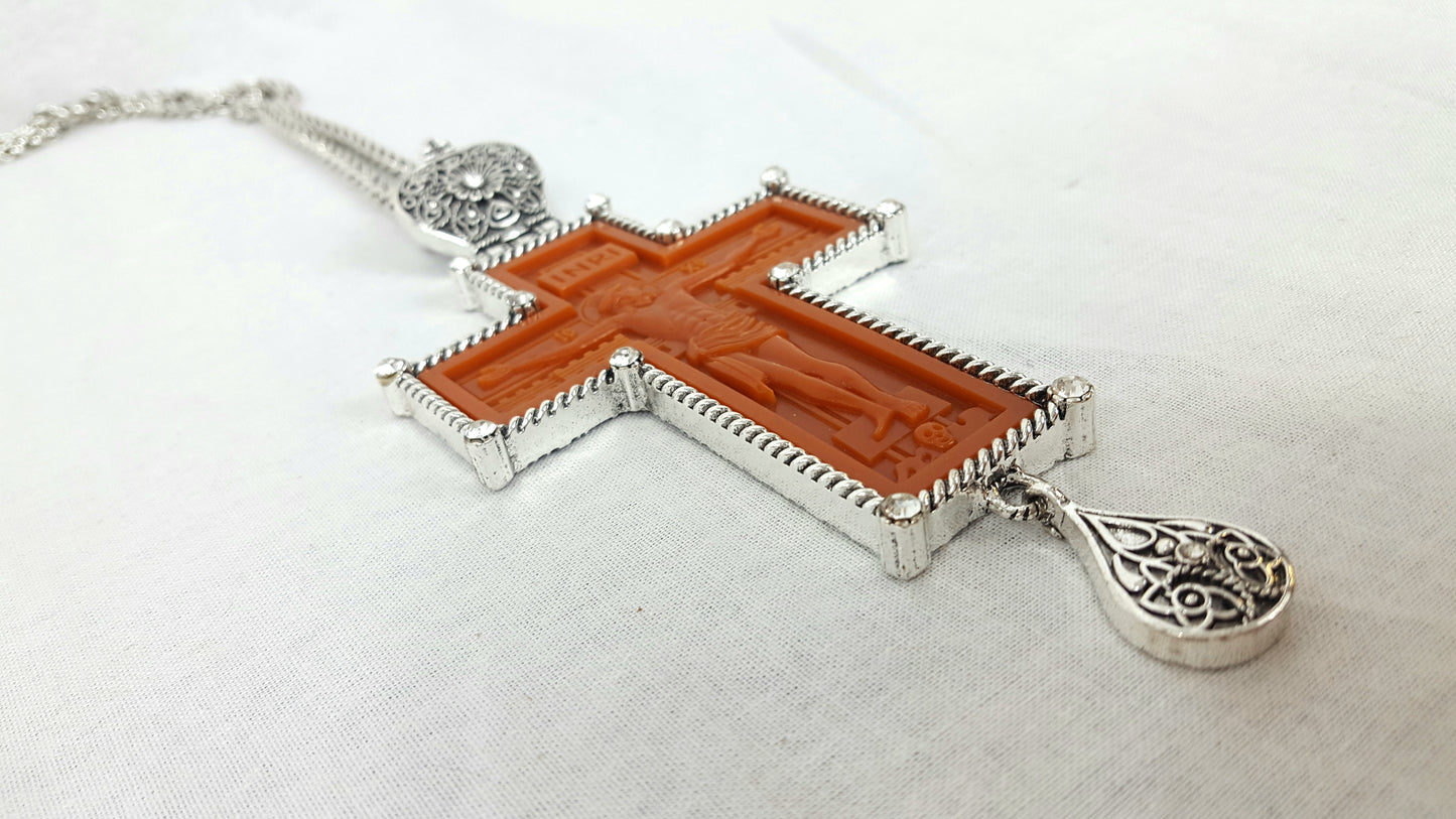 Jeweled pectoral crosses are worn by bishops, archimandrites and protopriests as a mark of their office, and may be awarded to other priests for distinguished service to the church. This jeweled cross features a bas-relief icon of the crucifixion of Christ with a gold or silver border on the front, and a gold or silver icon of a decorated miter above the cross itself. The reverse side is also engraved with a gold or silver icon of the cross.
