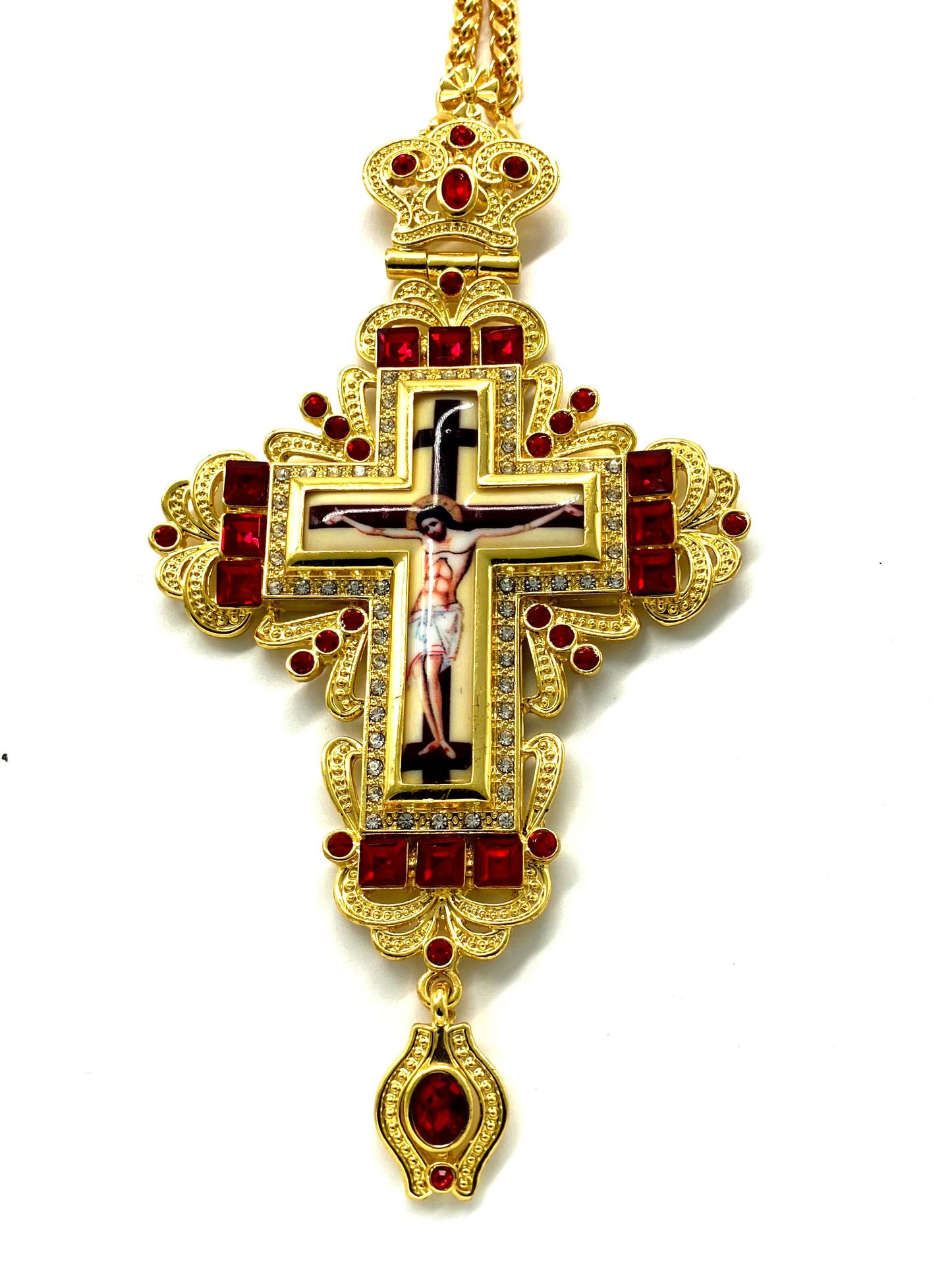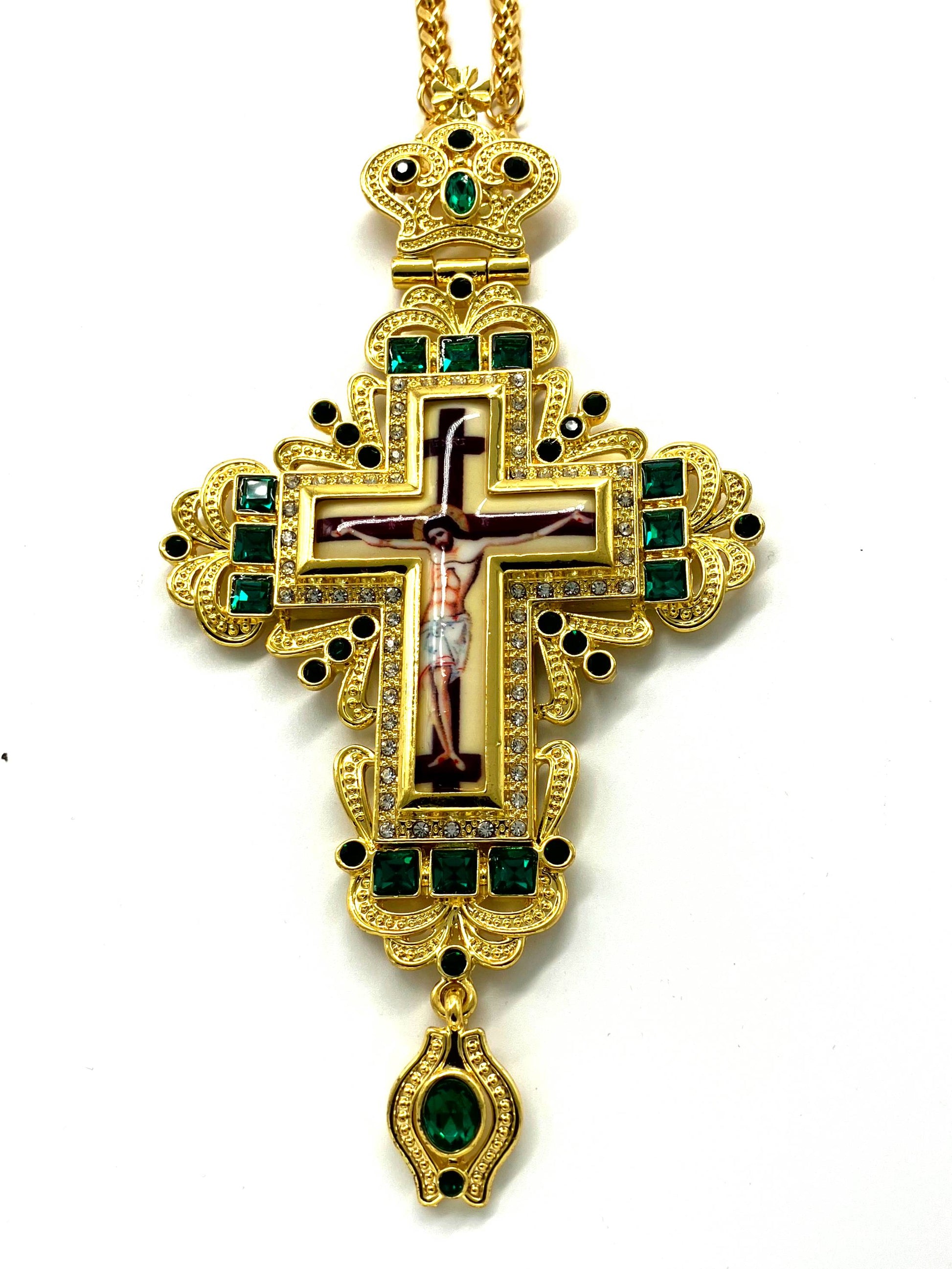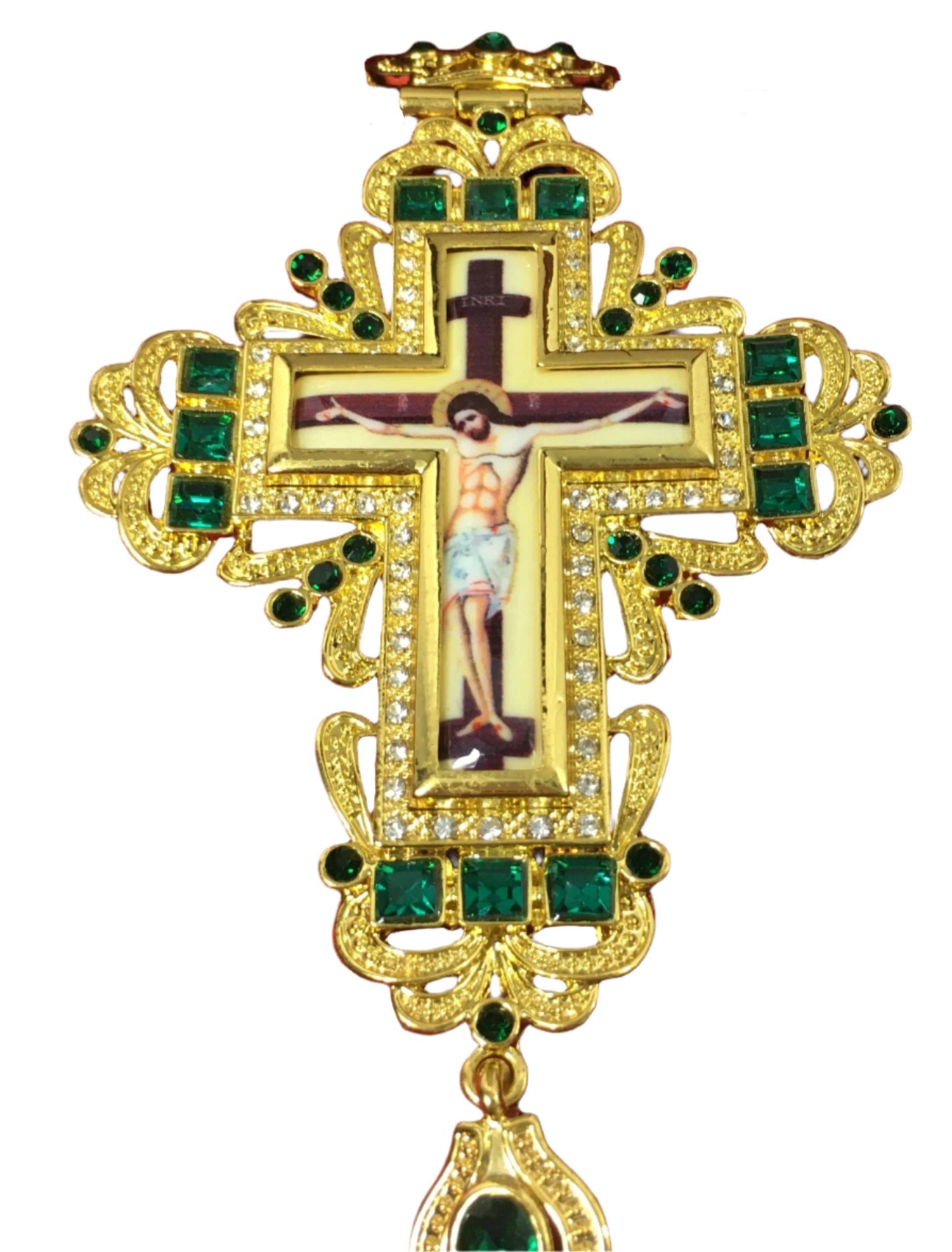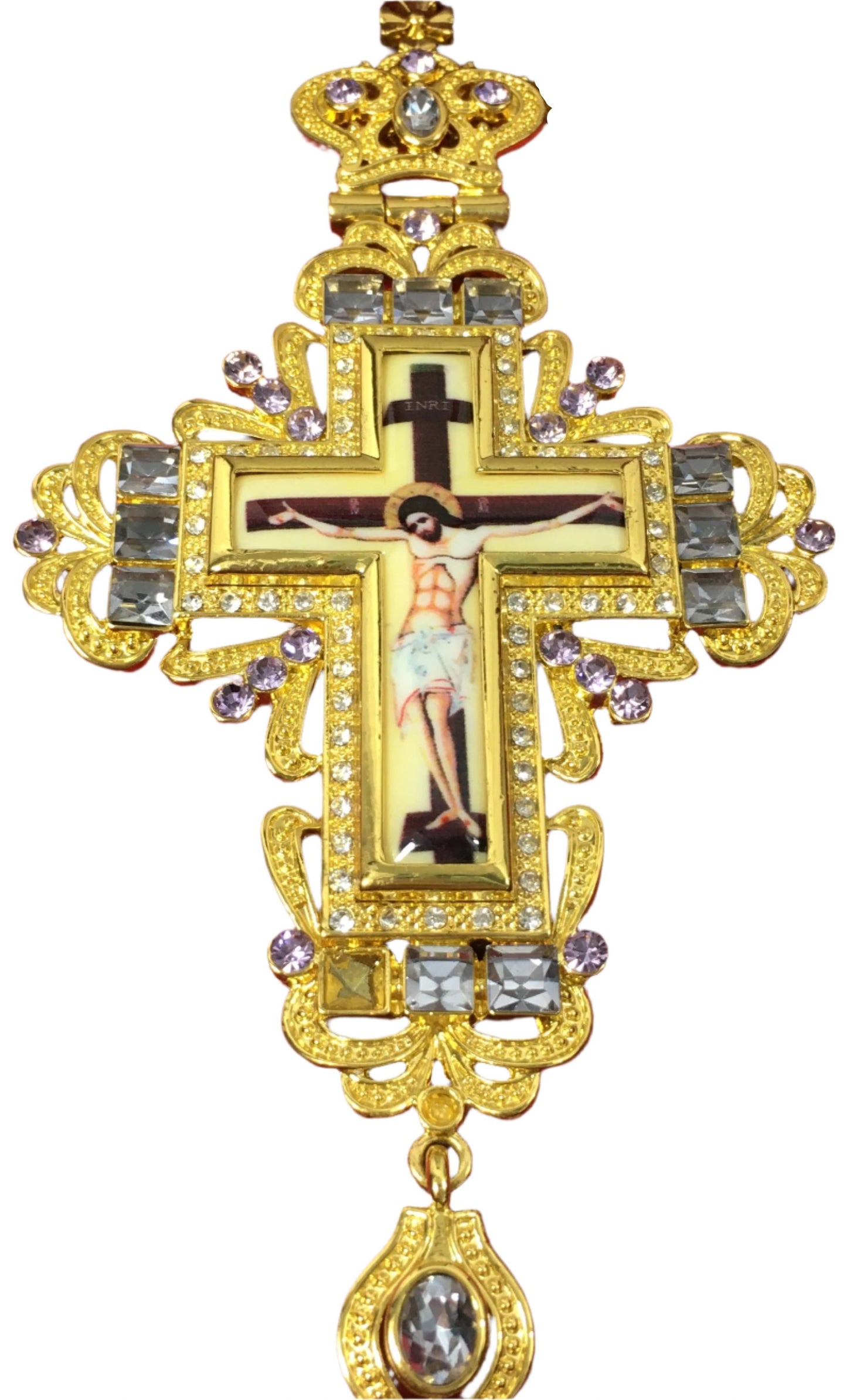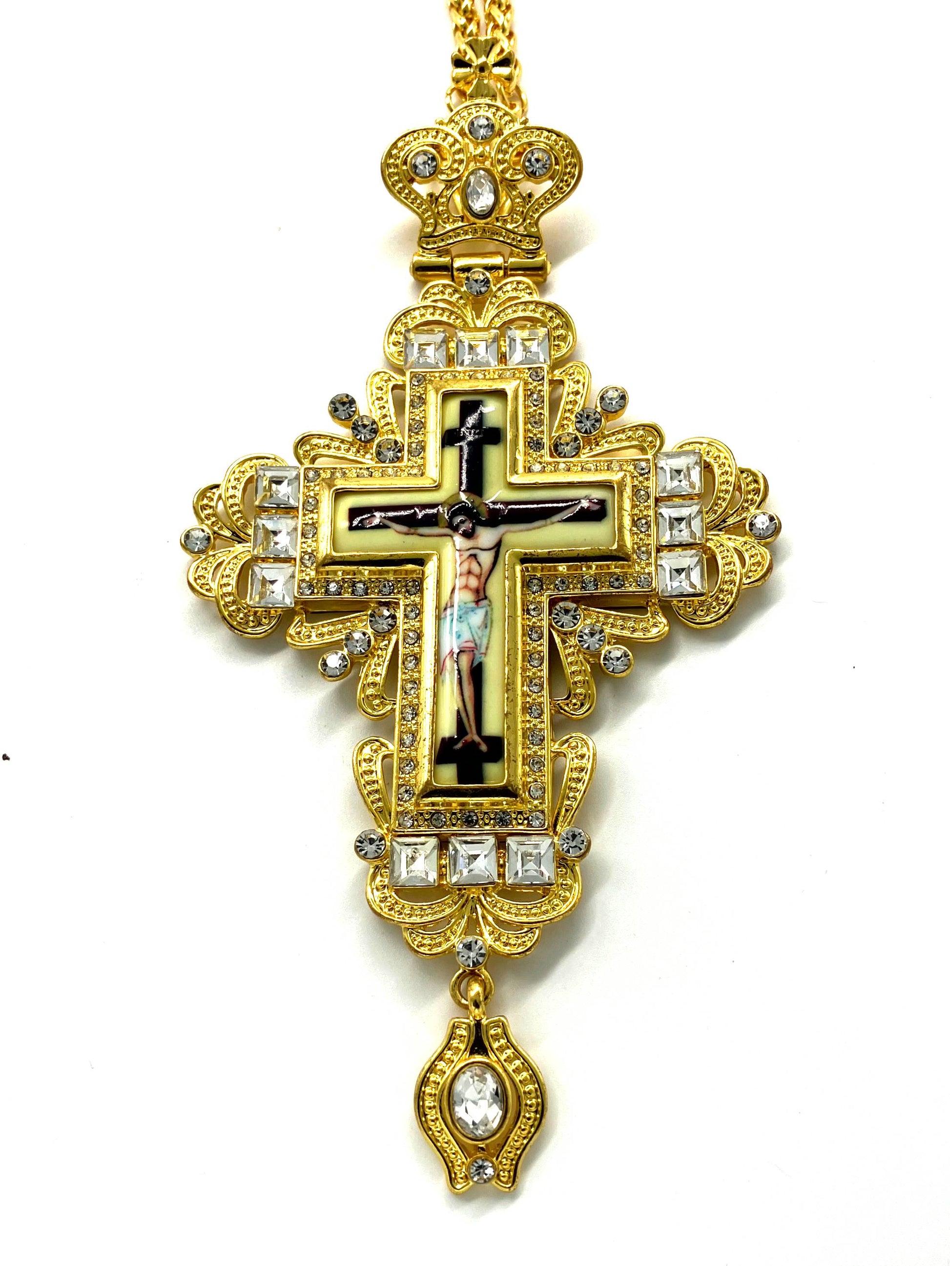 Jeweled pectoral crosses are worn by bishops, archimandrites and protopriests as a mark of their office, and may be awarded to other priests for distinguished service to the church. This jeweled cross features a painted icon of the crucifixion of Christ with a gold border and an icon of a decorated miter at the top.