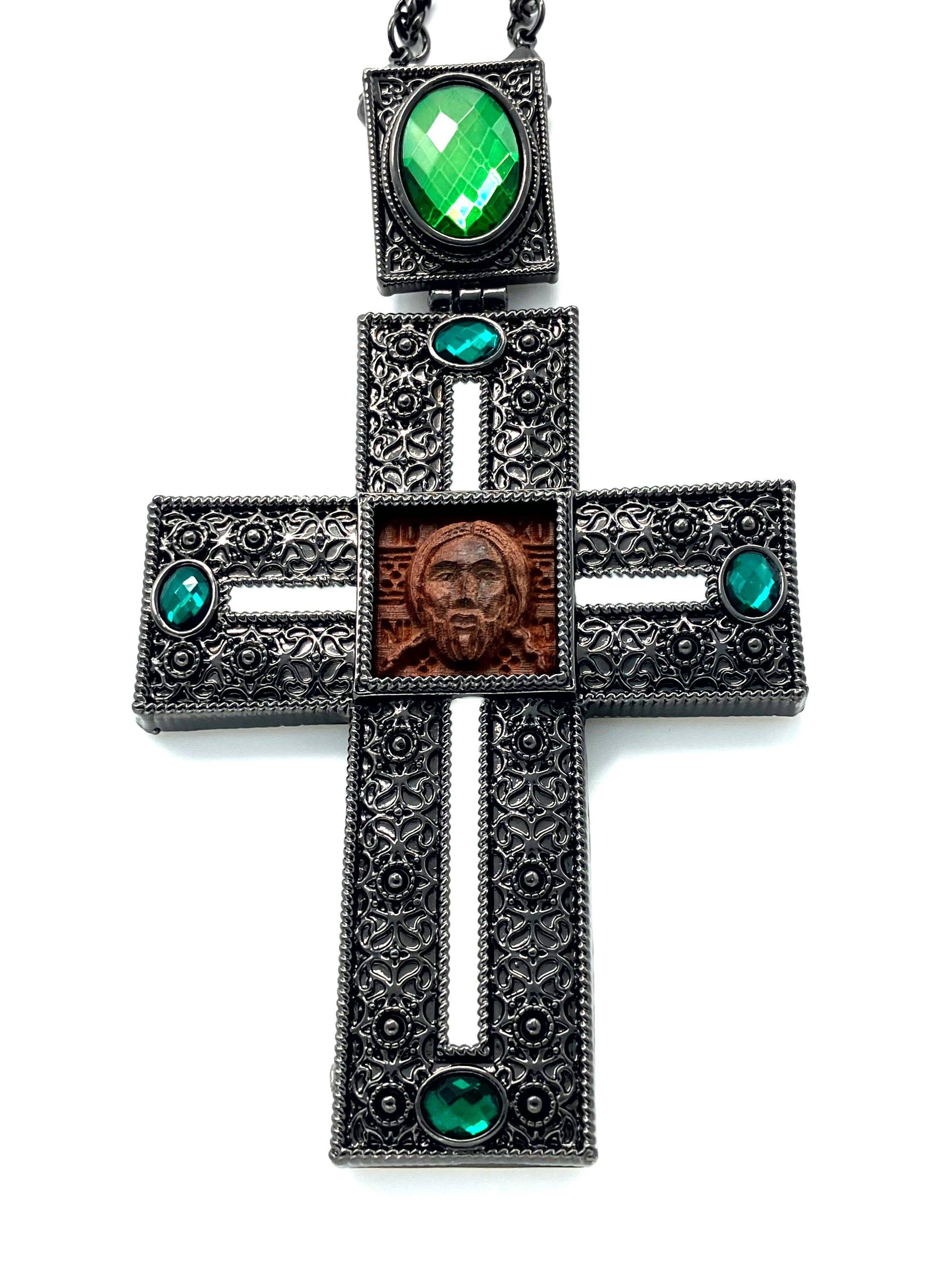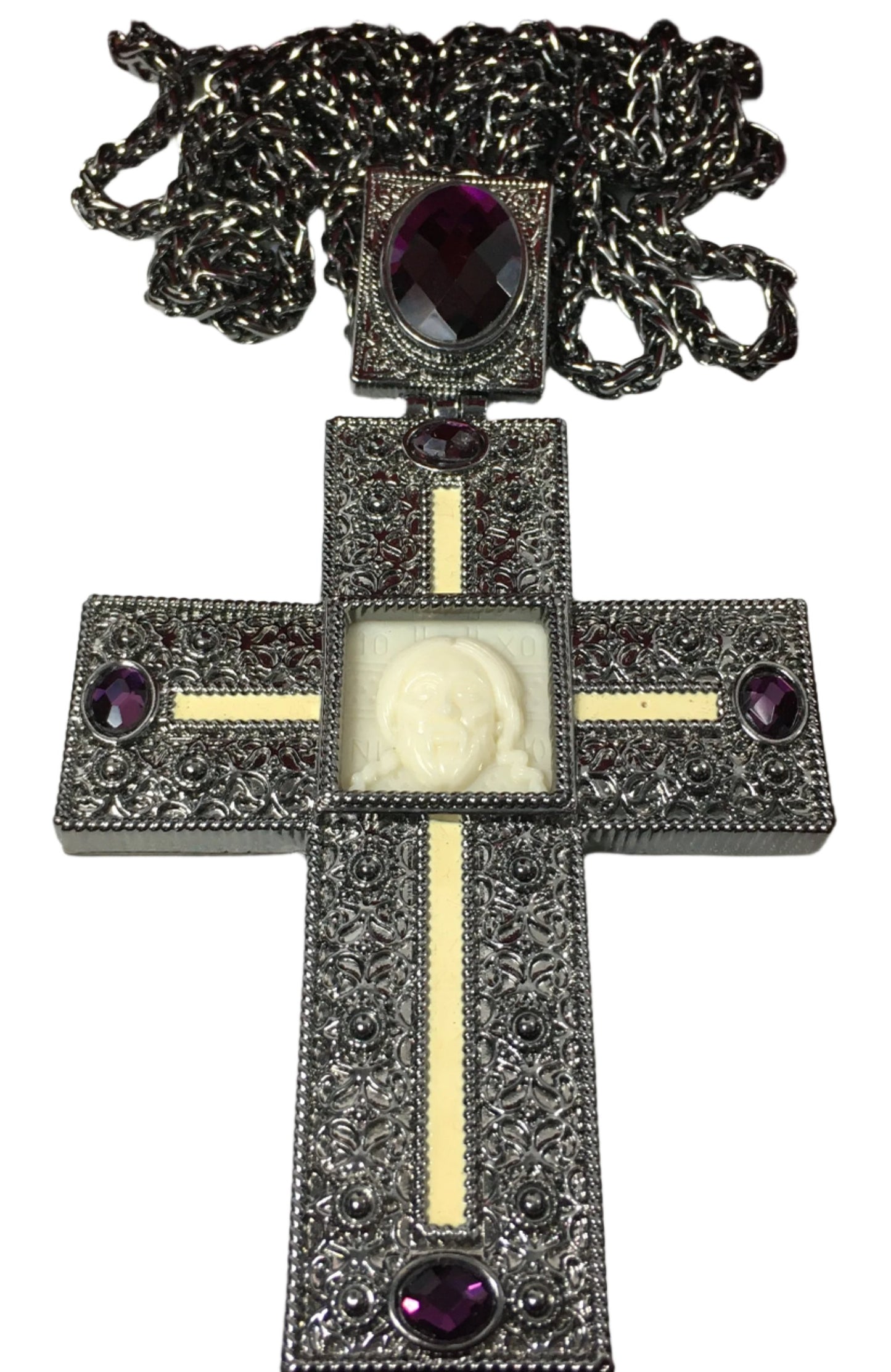 Jeweled pectoral crosses are worn by bishops, archimandrites and protopriests as a mark of their office, and may be awarded to other priests for distinguished service to the church. This jeweled cross features a bas-relief icon of the face of Christ over a white Latin-style cross on a black background.