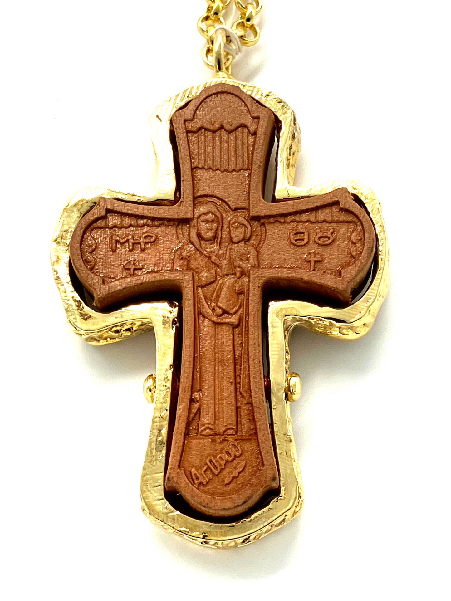 Jeweled pectoral crosses are worn by bishops, archimandrites and protopriests as a mark of their office, and may be awarded to other priests for distinguished service to the church. The front of this small jeweled cross features a wooden bas-relief icon of the crucifixion of Christ with a metallic golden border. The reverse side features a bas-relief of the Theotokos in the Hodigitria style.