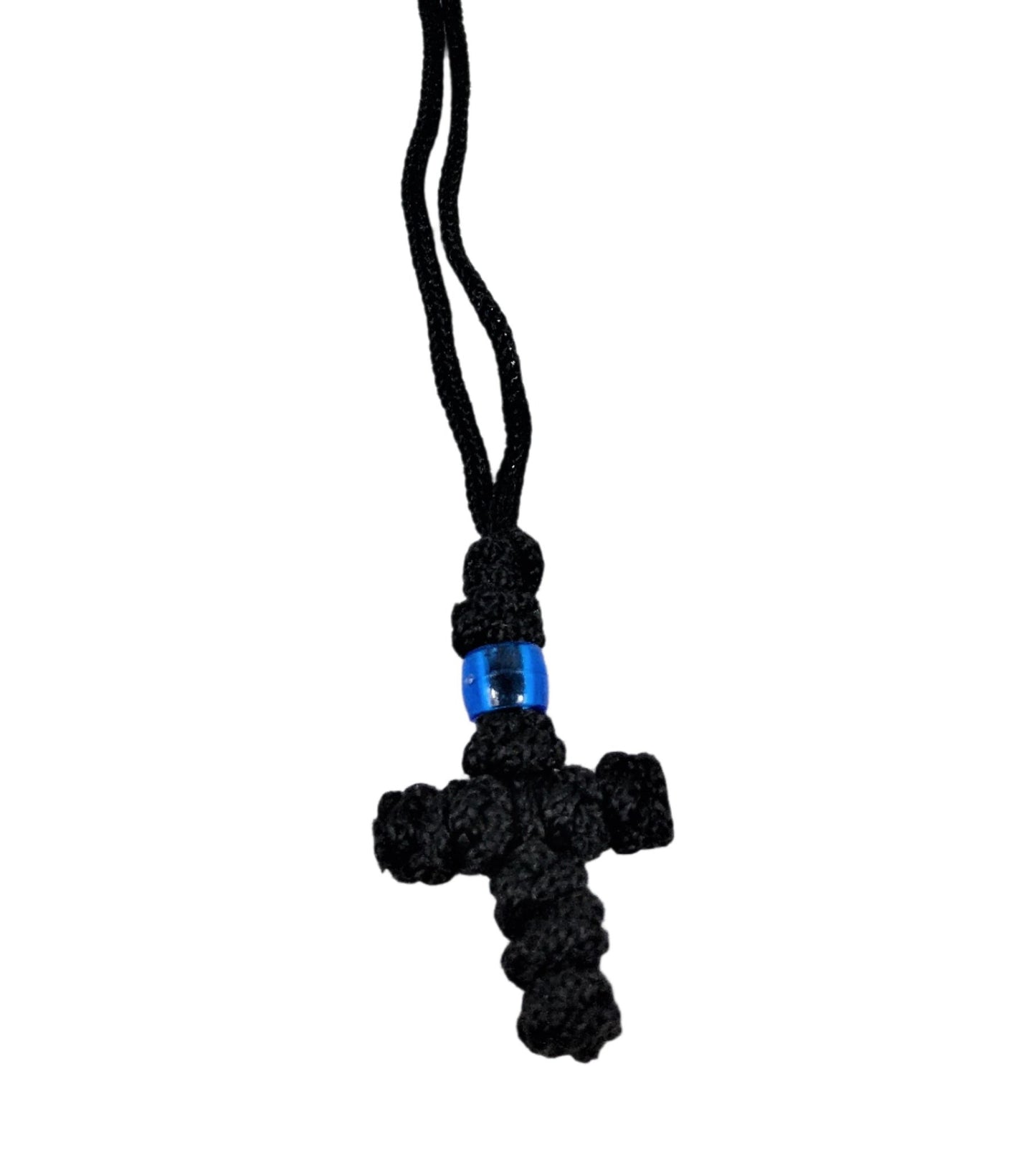 Simple rope necklace with pendant prayer-rope style cross. Can be worn around the neck as a continual reminder of the power of prayer and the grace of baptism.