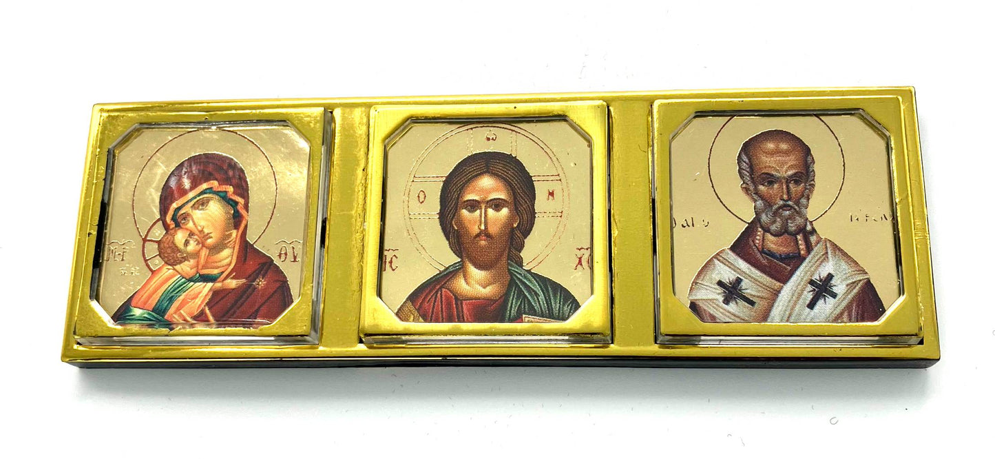 This small triptych of the Savior, the Theotokos and St. Nicholas features golden icon backgrounds and three small golden icon frames. Attaches securely to ferromagnetic surfaces after removal of metallic shipping cover over magnet.