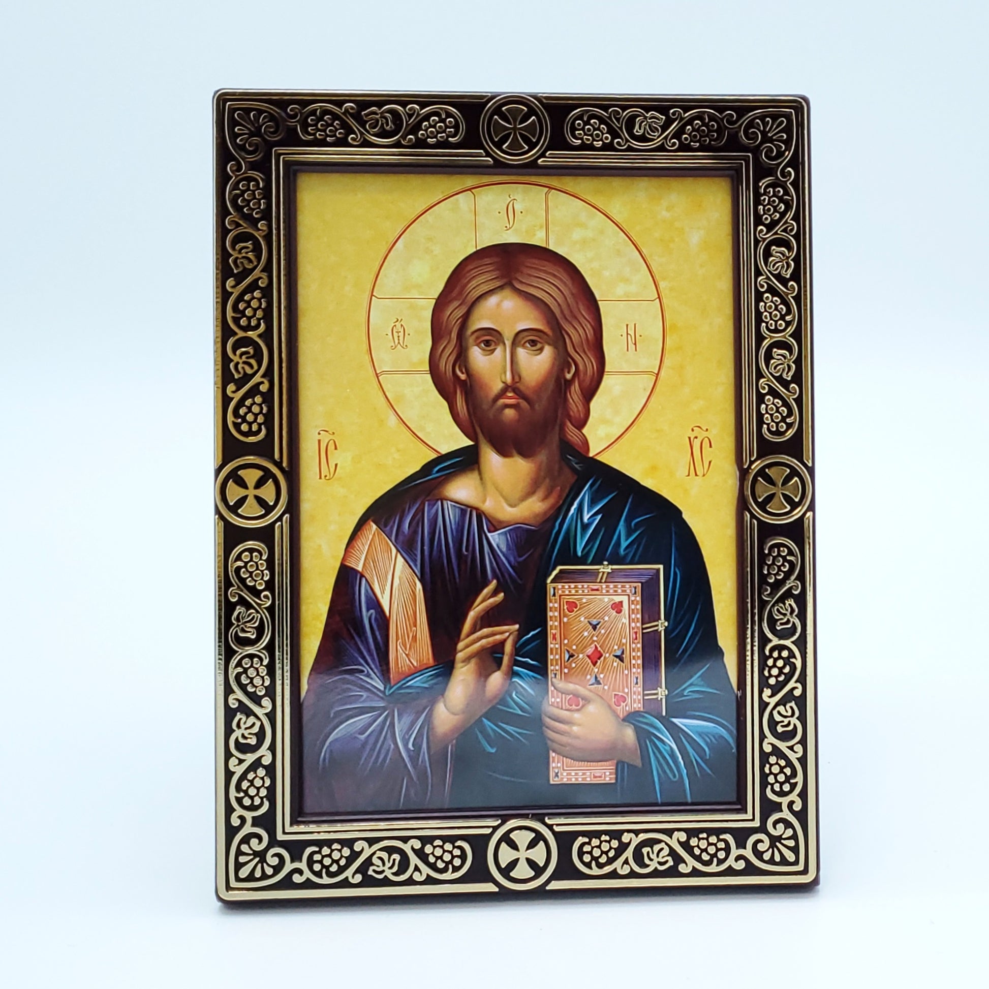 This beautifully crafted desktop icon features an original Jordanville icon design of Christ, faithfully reproduced with rich detail and vibrant colors. Handcrafted in Greece, the icon is mounted on a sturdy 3/8-inch thick wooden backing and framed with an elegant ornamental border adorned with grapevine motifs. A pull-out stand on the back allows for easy placement on flat surfaces, making it a perfect addition to any home.