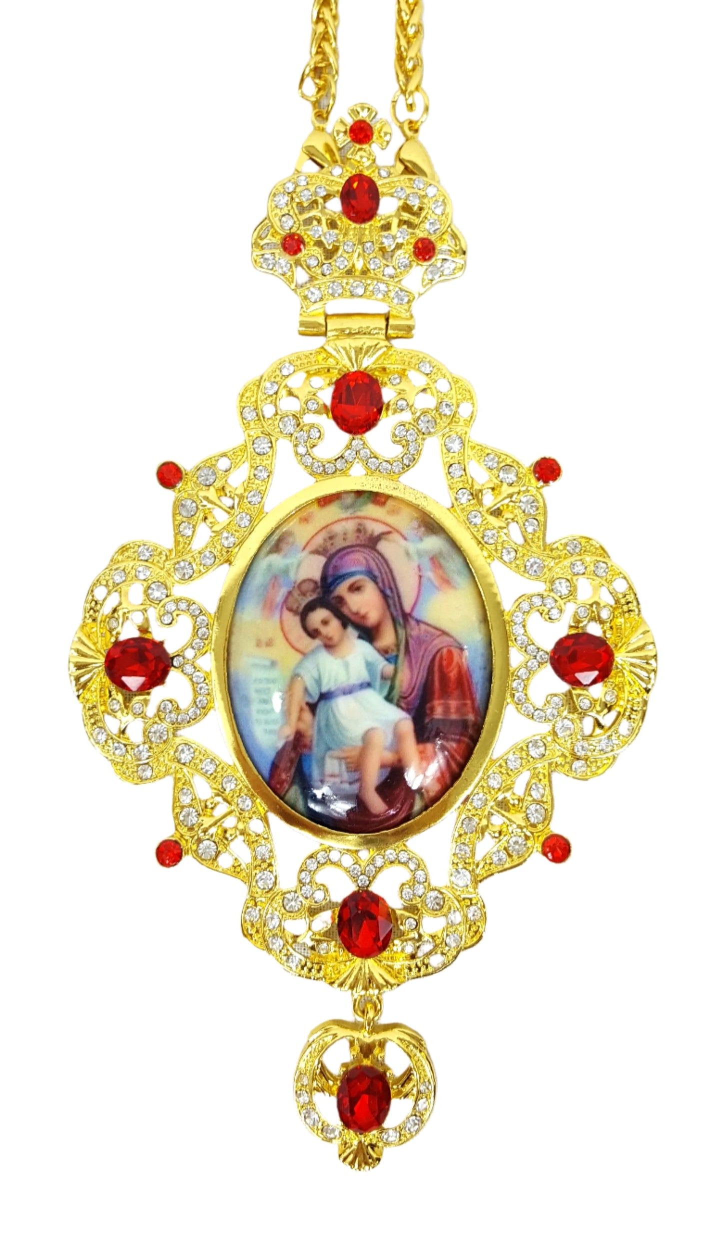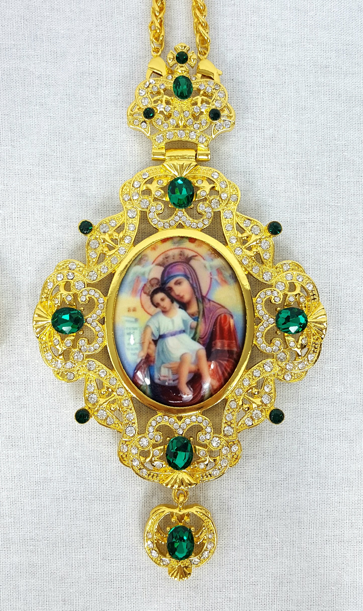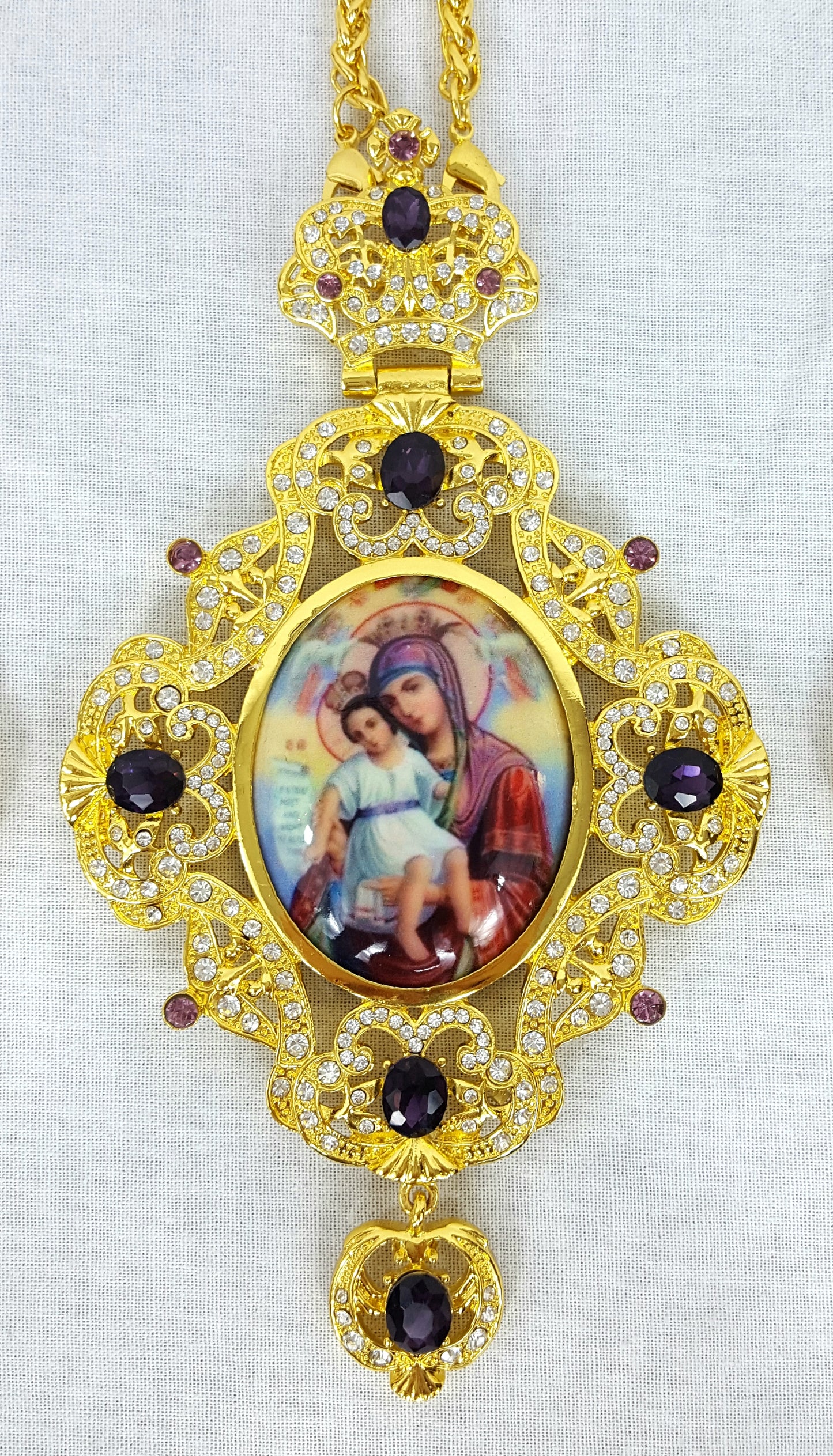 A Panagia (from the Greek Παναγία) is a medallion bearing an icon of the Mother of God and is worn by Orthodox bishops. This Panagia features a painted icon of the Theotokos surrounded by a jeweled golden border, and hangs on a gold chain.
