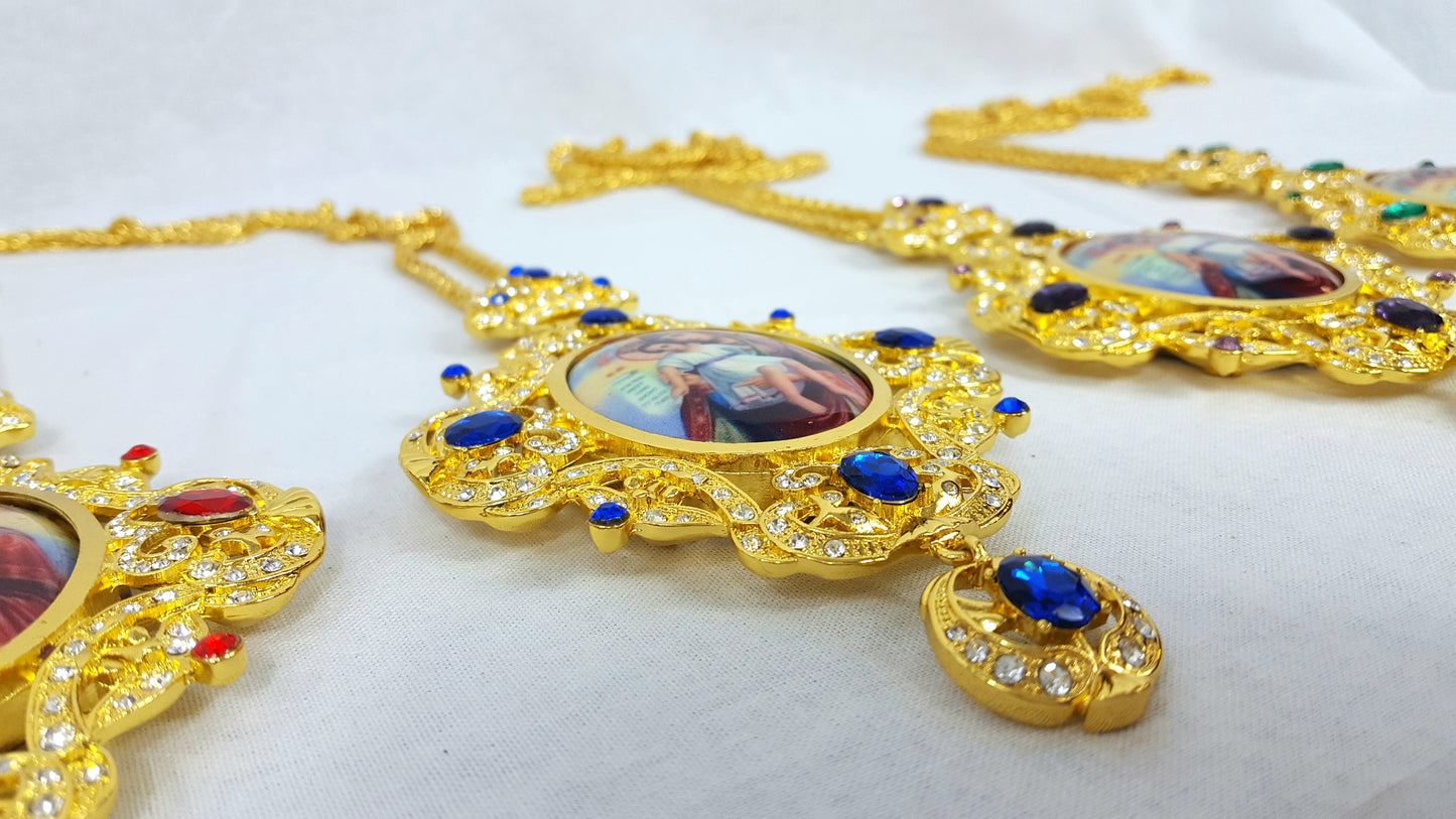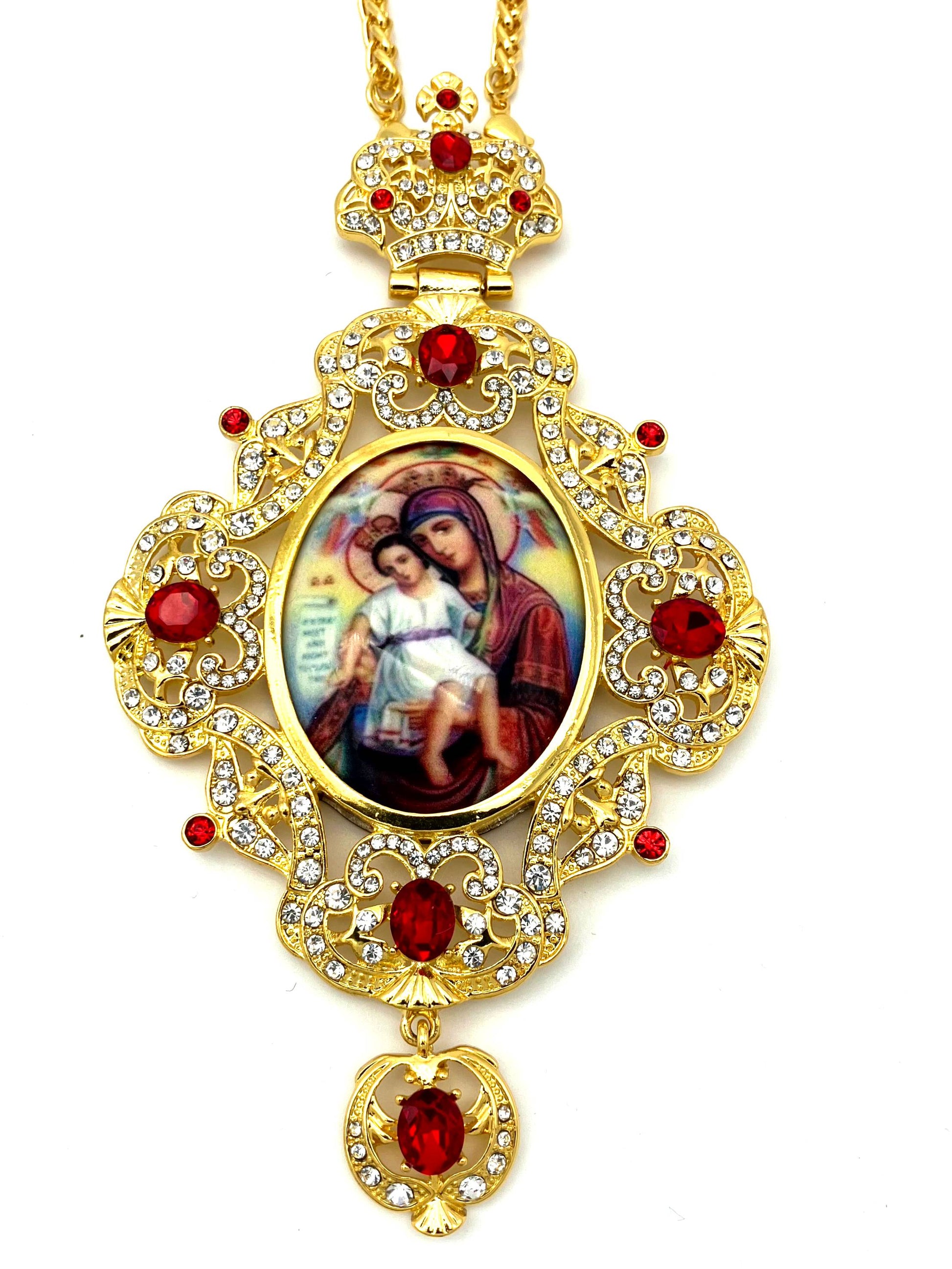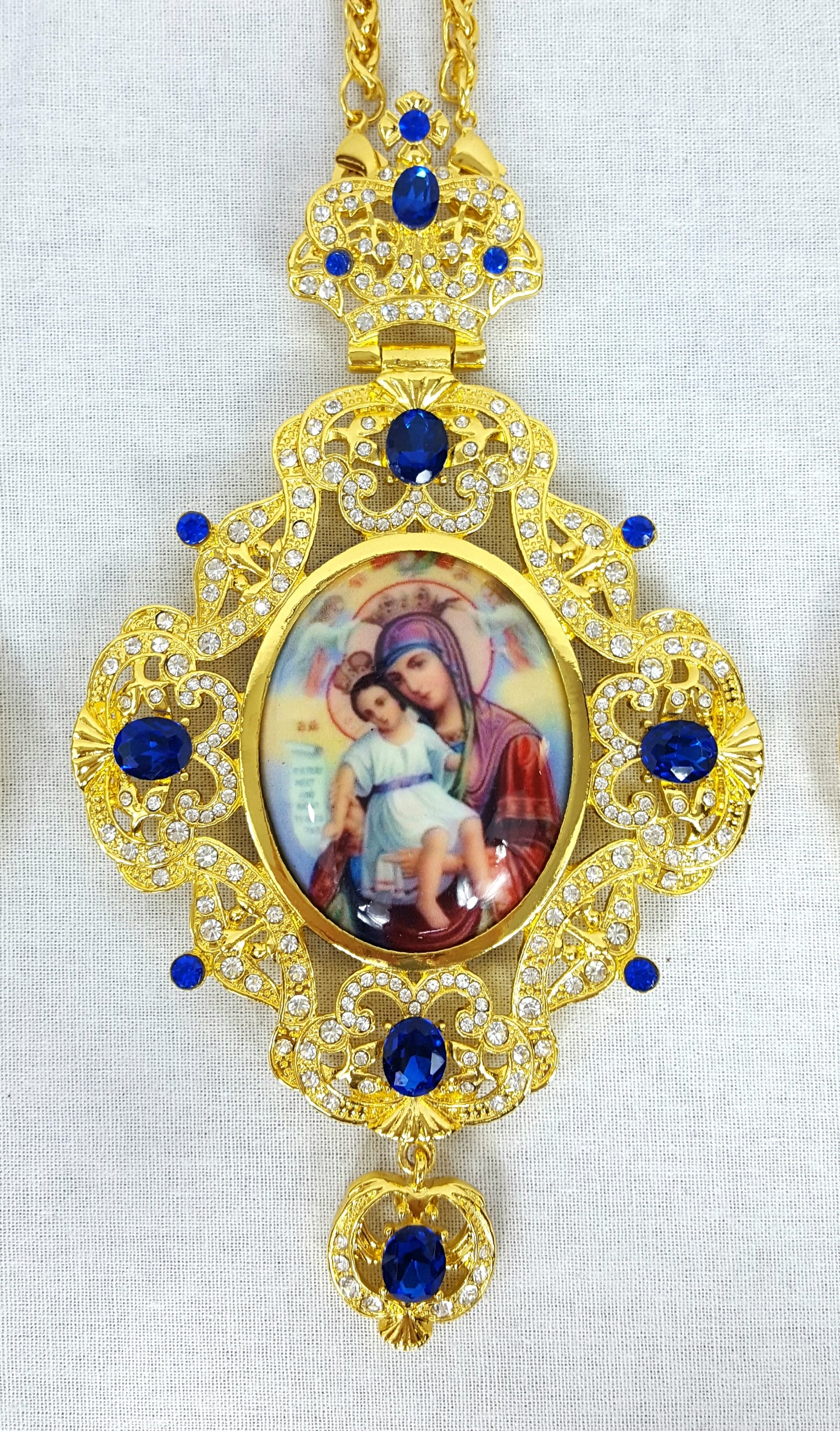 A Panagia (from the Greek Παναγία) is a medallion bearing an icon of the Mother of God and is worn by Orthodox bishops. This Panagia features a painted icon of the Theotokos surrounded by a jeweled golden border, and hangs on a gold chain.