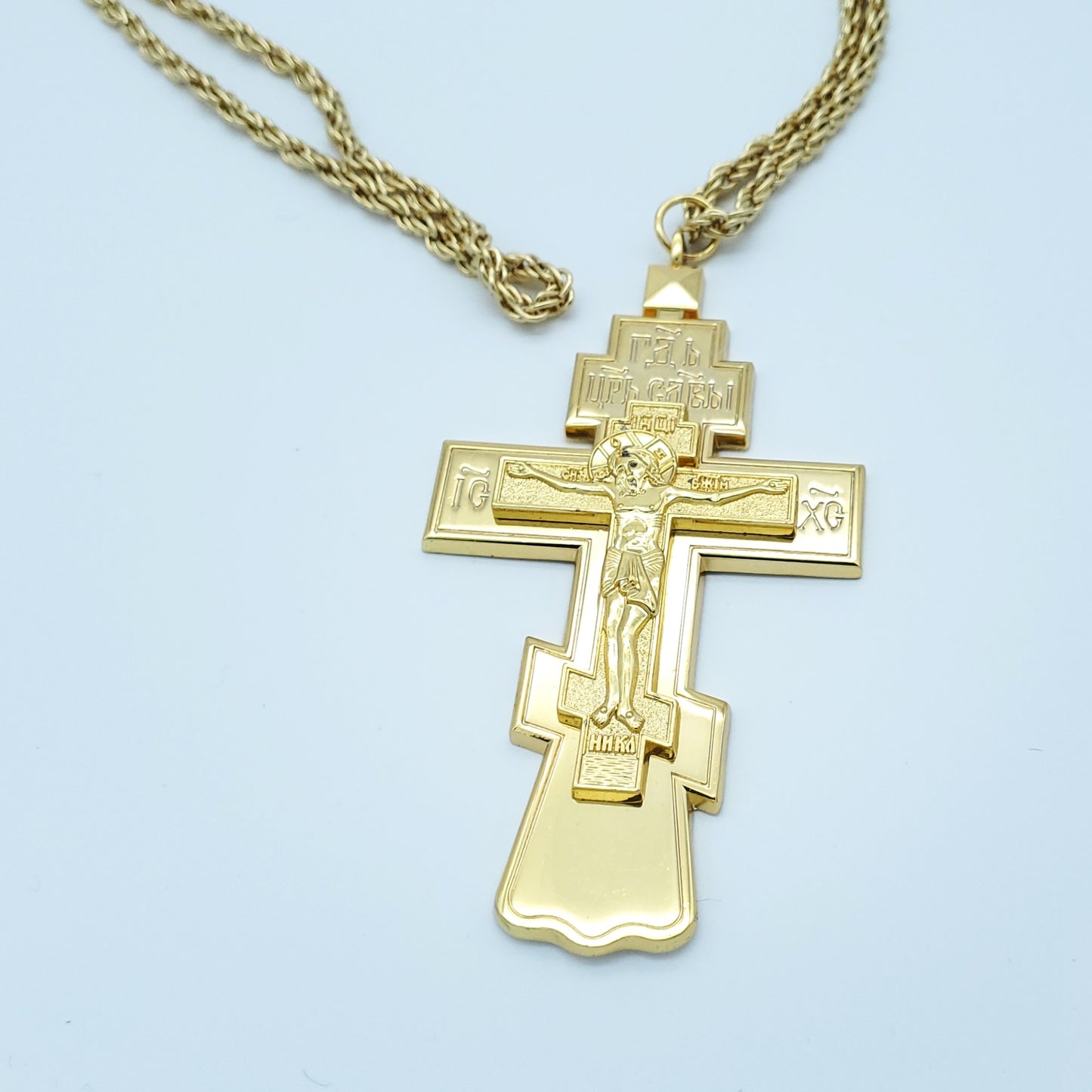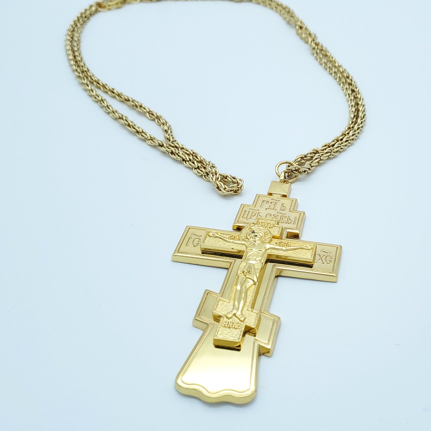 Pectoral crosses are worn by archpriests, abbots and abbesses as a mark of their office, and may be awarded to other priests for distinguished service to the church. This gold-plated pectoral cross is is in the Russian style and hangs on a golden chain. It is also features a metallic bas-relief icon of the crucifixion of Christ on its face.