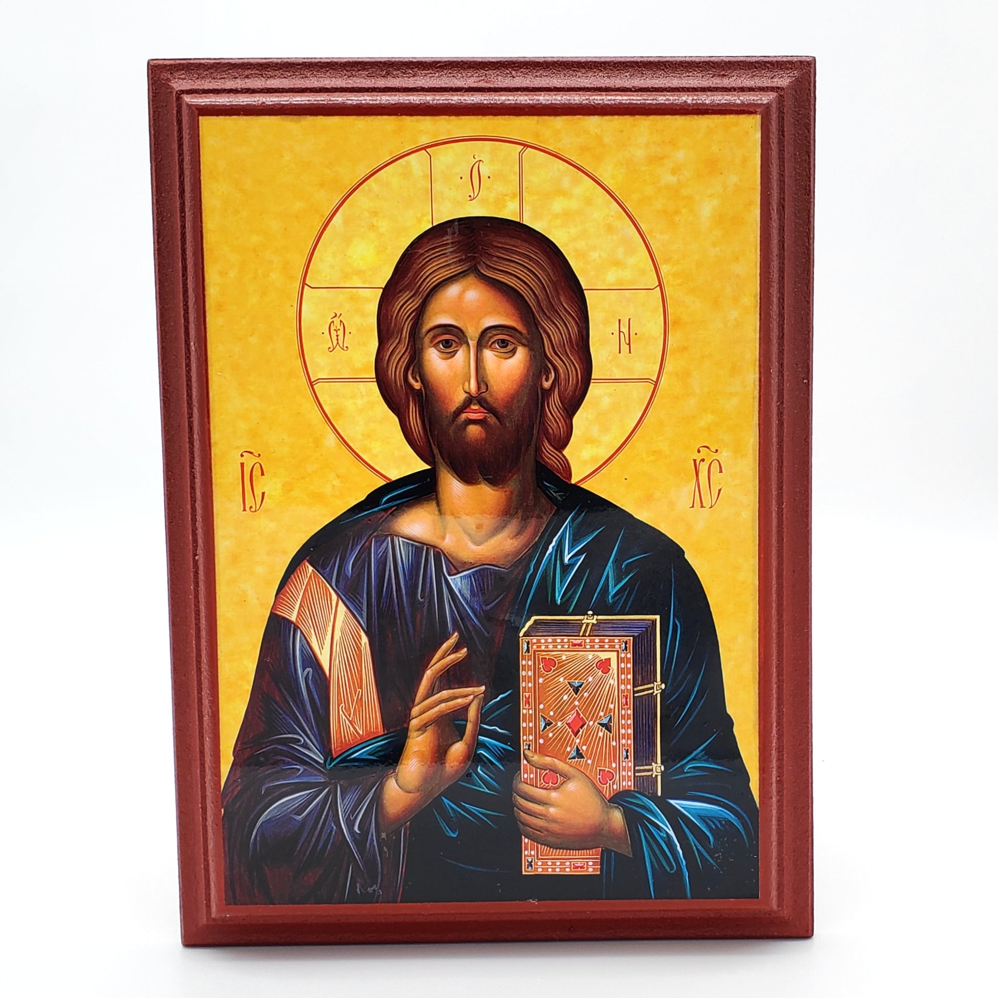 This beautifully crafted wall icon features an original Jordanville icon design of Christ, faithfully reproduced with rich detail and vibrant colors. Handcrafted in Greece, the icon is mounted on a sturdy, reddish-brown, wooden frame with a bevel that accentuates the icon.