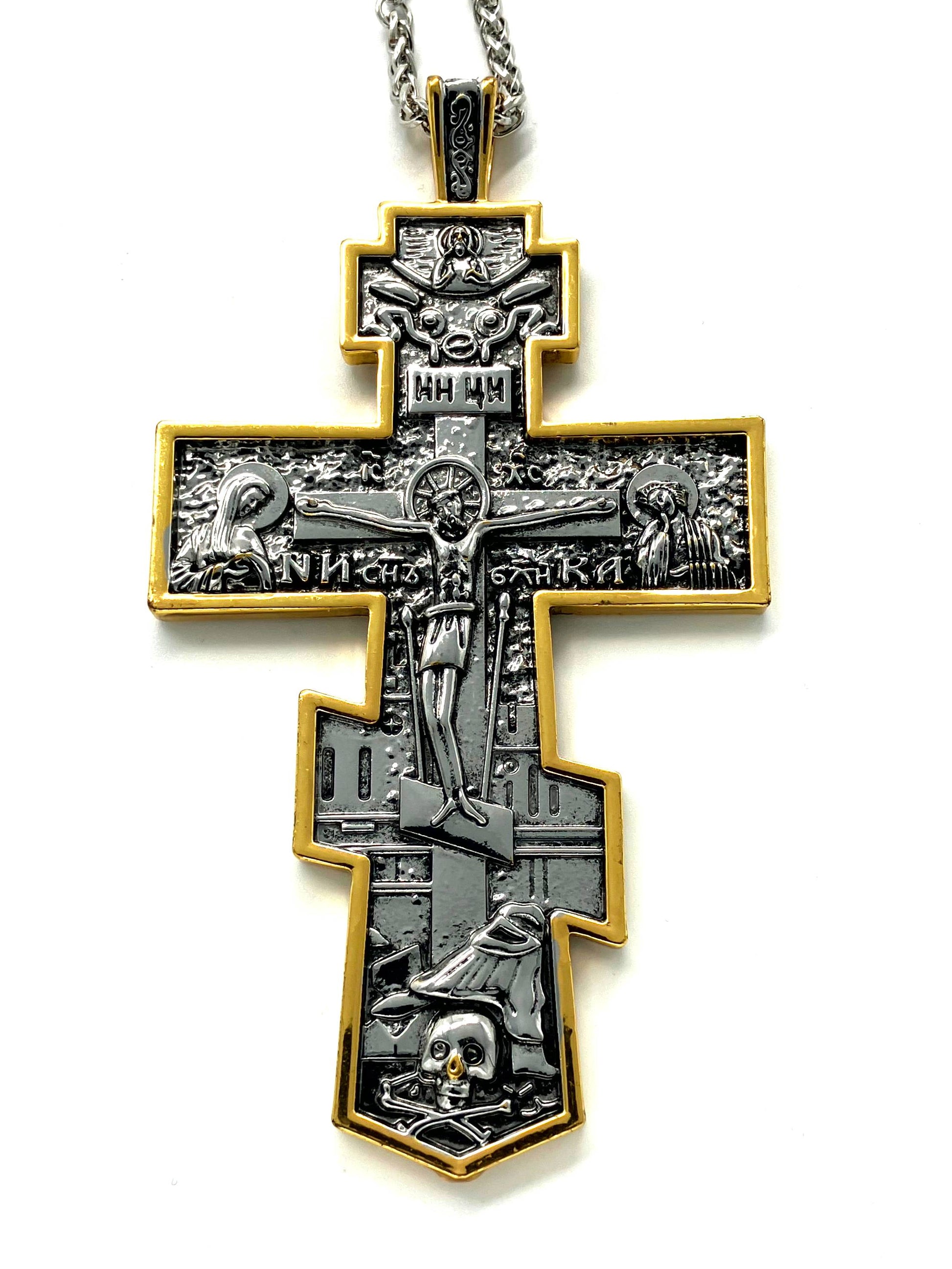 A silver pectoral cross is traditionally given to an Orthodox priest on the day of his ordination.  This pectoral cross is in the Russian style and features a bas-relief engraving of the crucifixion of Christ on its face.  It is also engraved with a Slavonic motto on the reverse (see photo).