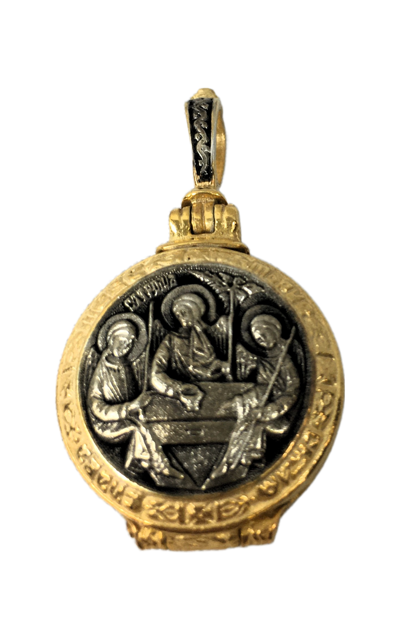 This finely crafted pendant features metallic icons of the Cross (on front) and of the Holy Trinity / hospitality of Abraham (on back). The golden border variety is also plated with gold around the edges.