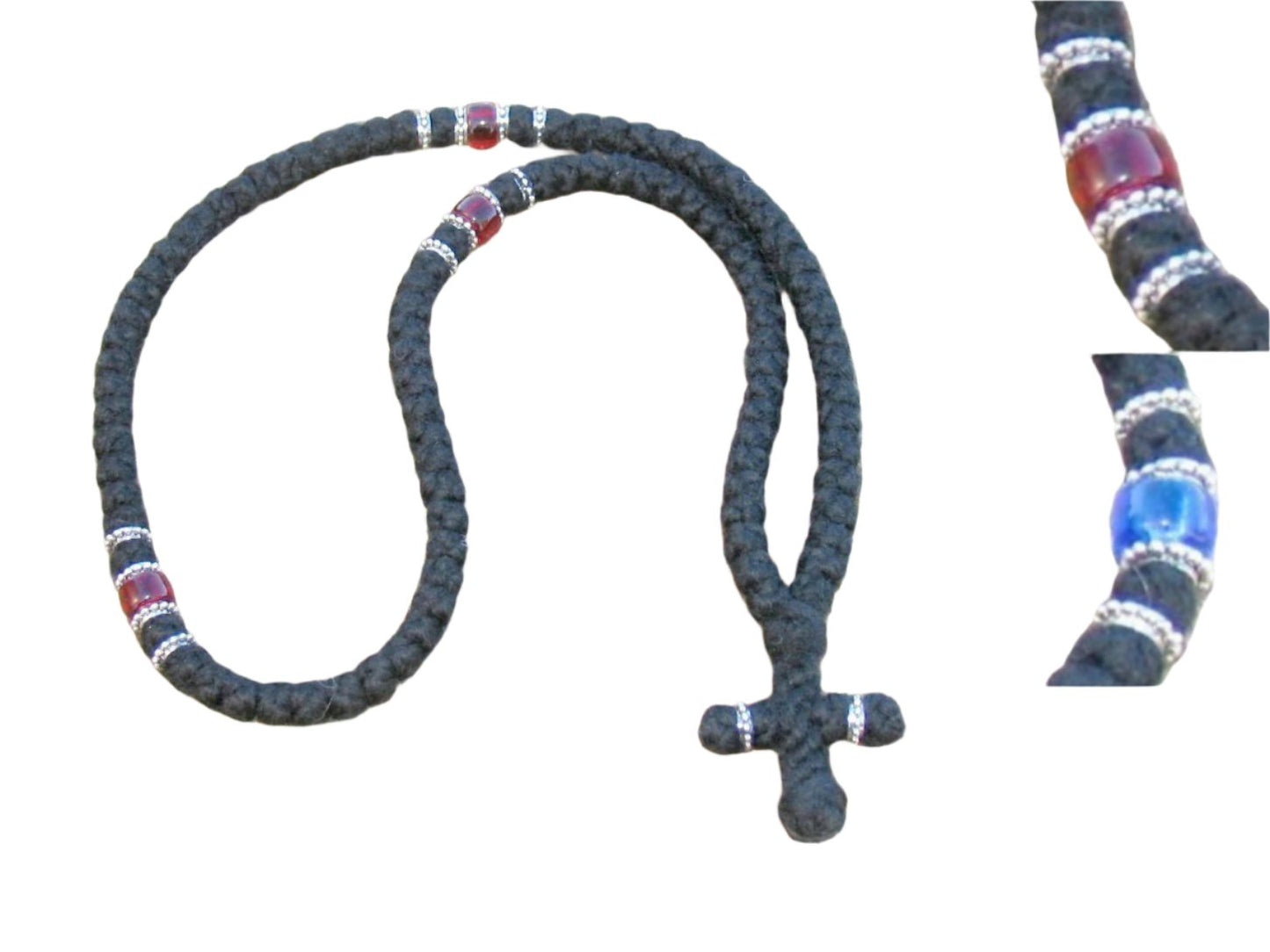 This prayer rope is made with 3-ply Athos yarn which makes medium sized knots. It is adorned with accent beads and metallic spacers every 25 knots.