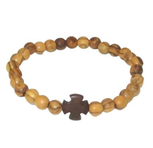 This olive wood prayer bracelet is made with hand-carved beads from Bethlehem, joined by a brown buri seed cross. Strung on black stretch "Power Cord." Made with 6mm beads. Inner circumference of 6 - 6.25".