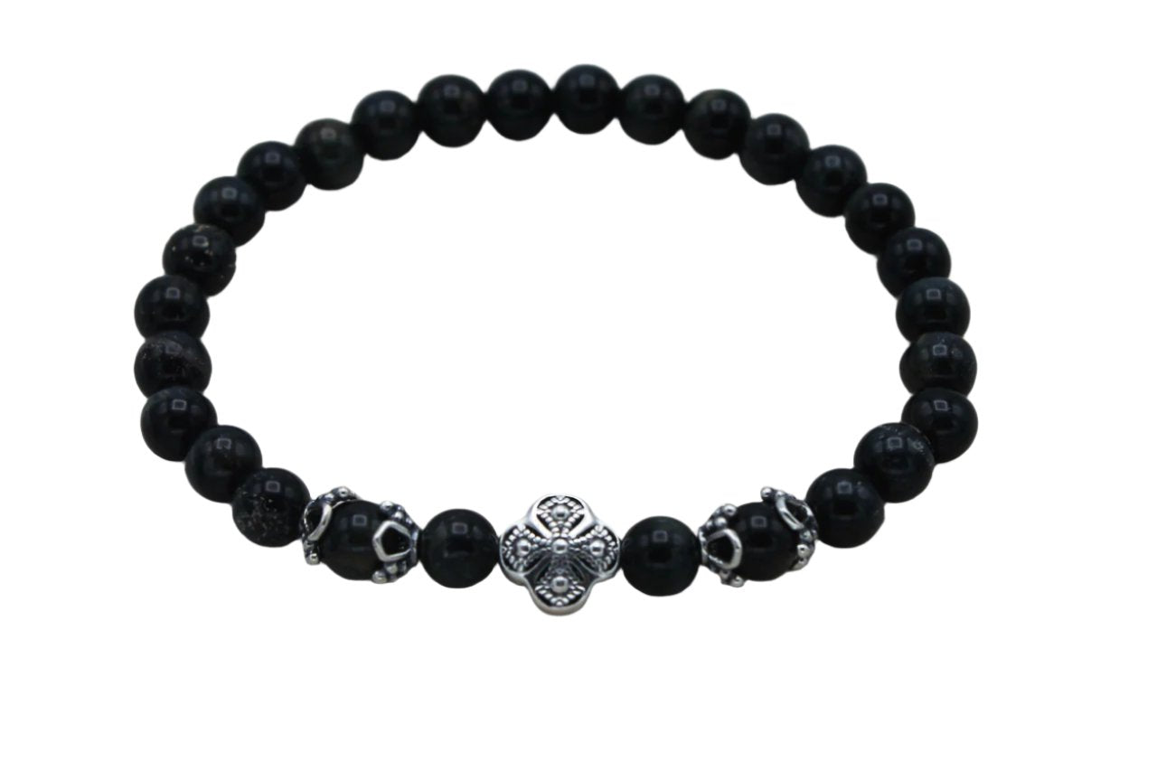 Blue Tiger Eye is a deep navy blue stone with small veins of lighter blue throughout. Semi-precious stone prayer bracelet embellished with sterling silver accents and a sterling silver cross-bead. Strung on clear, stretch "Power Cord". Each prayer bracelet has 28 beads and an inner circumference of 6.5 - 6.75".