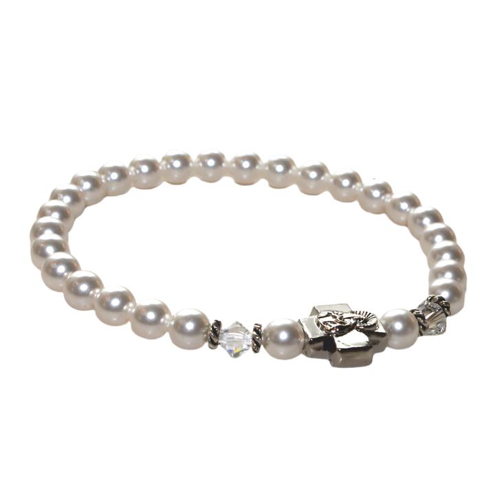 These beautiful prayer bracelets are made from Swarovski Crystal Pearls (6mm), adorned with Swarovski crystal accents and Mother of God cross beads and come in a palette of shimmering colors. The pearls resist chemicals, perfumes and UV rays. Strung on clear, stretch "Power Cord". The bracelet has an inner circumference of 6.5".
