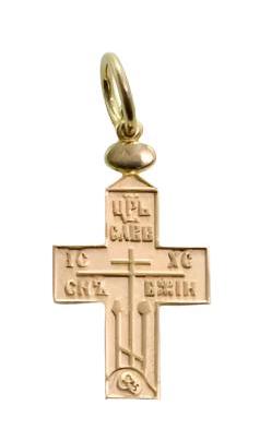 This 14 karat gold baptismal cross features a Russian style cross on its face and a Slavonic inscription on the reverse (see photo).