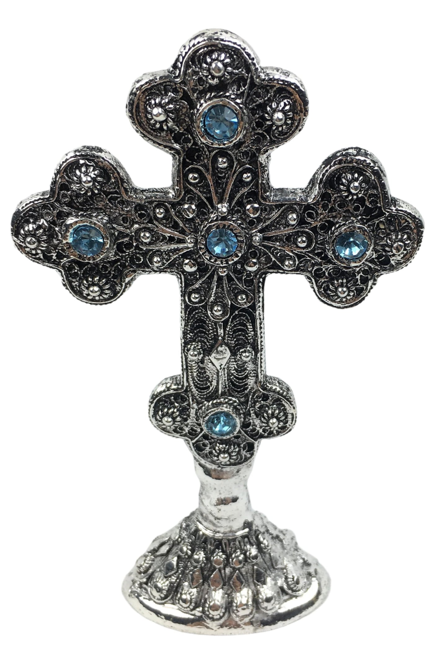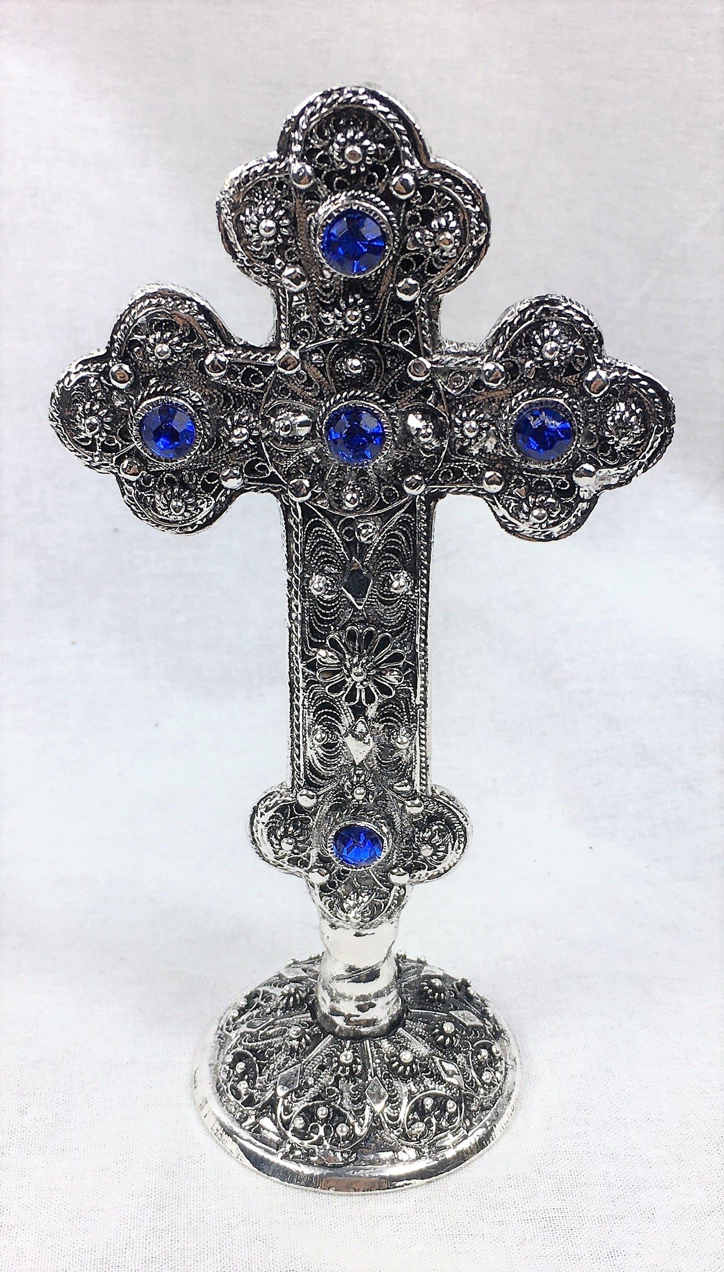 These durable, solid metal crosses come in two sizes. All are adorned with five jewels in either light blue, dark blue, red or green.