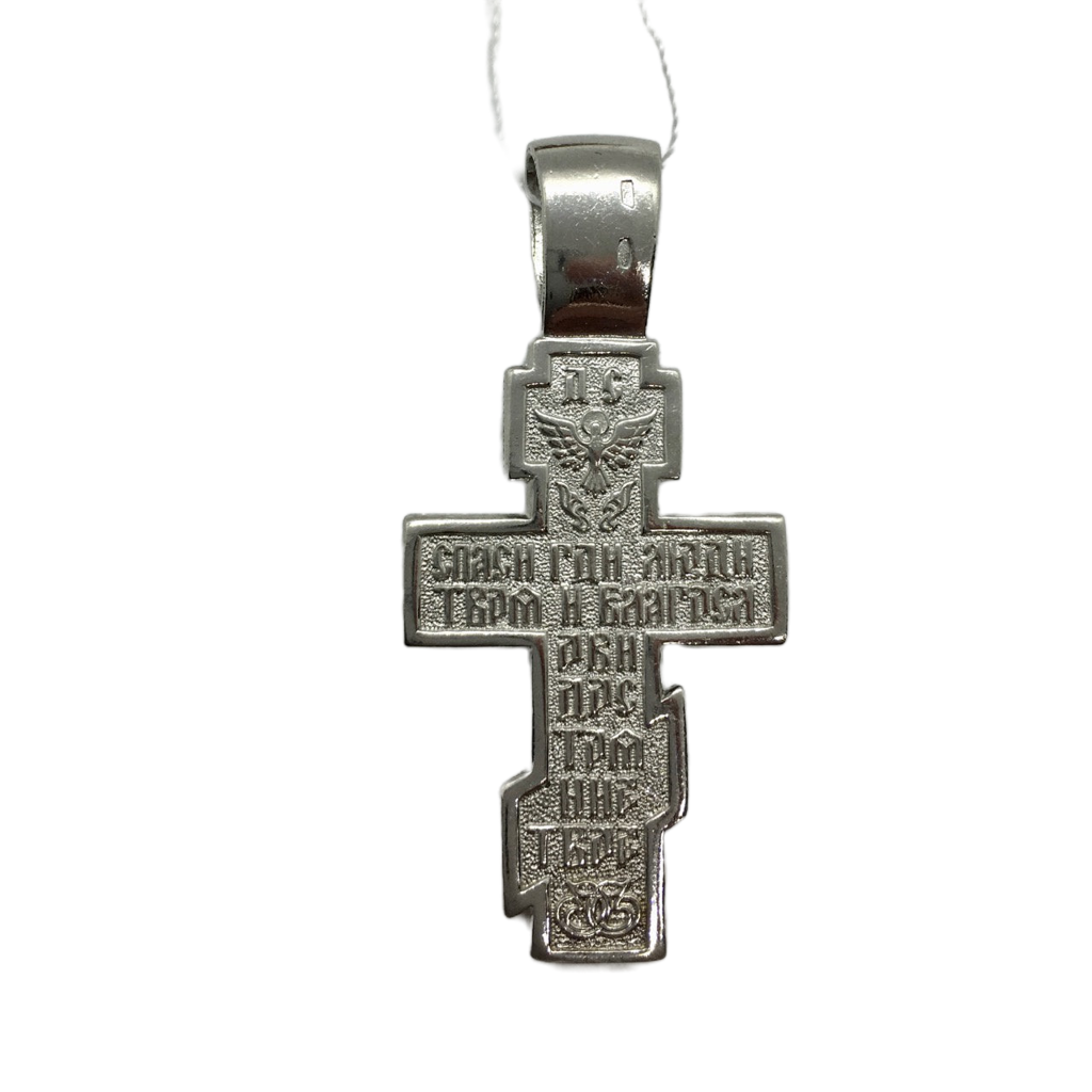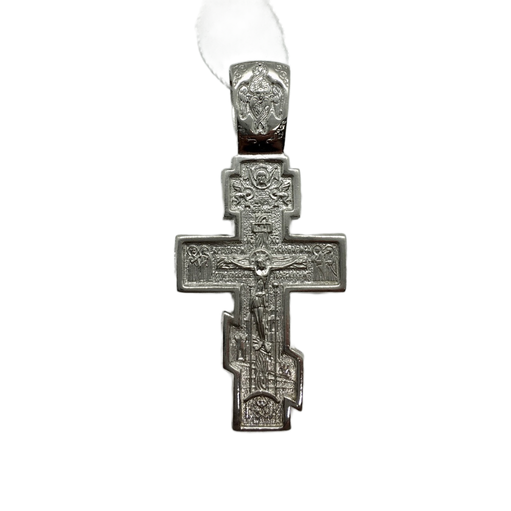 This sterling silver baptismal cross features a bas-relief icon of the crucifixion of Christ on its face and a Slavonic inscription on the reverse. It is also rhodium plated to enhance durability.