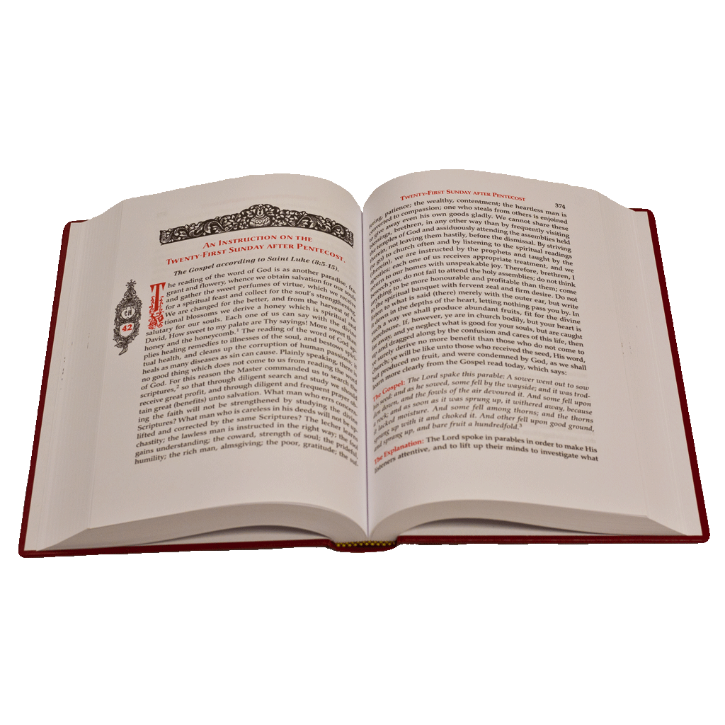"This book, The Gospel Commentary, represents a living link with tradition. It is a collection of homilies for the Sundays and feast-days of the church year, drawn from the Holy Fathers and customarily read in church. The book is not credited to its actual author, but rather ascribed to Saint John Chrysostom: such an attribution simply reflects the Church's esteem for Chrysostom as the most masterful and eloquent of scriptural interpreters. It is actually a compilation drawn heavily on Chrysostom, but also on other Fathers...it is reasonable to assume that (this work) is the compilation of Patriarch Philotheus of Constantinople, who drew the scriptural commentary from earlier fathers and added his own preface and conclusion to each chapter. Usually the preface is of a rhetorical nature and the concluding passage is a moral exhortation."
