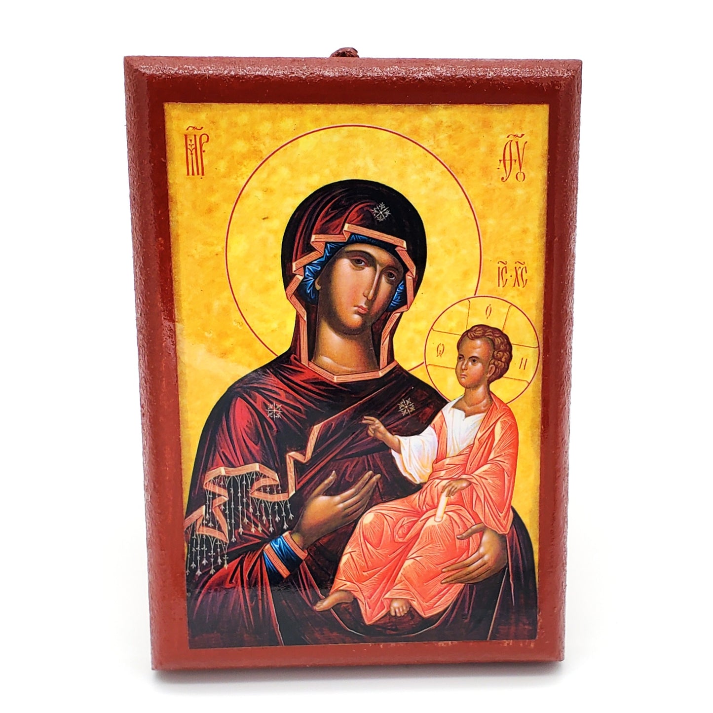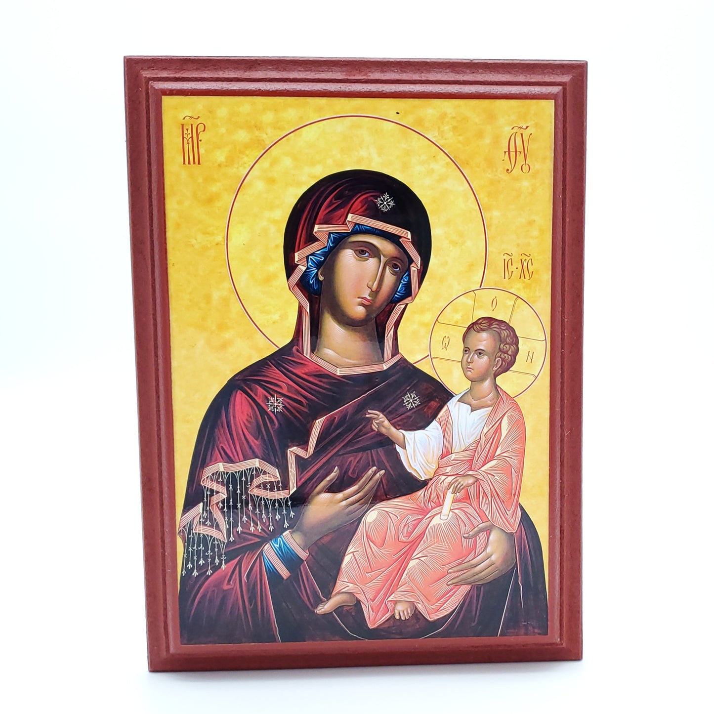 This beautifully crafted wall icon features an original Jordanville icon design of the Theotokos, faithfully reproduced with rich detail and vibrant colors. Handcrafted in Greece, the icon is mounted on a sturdy, reddish-brown, wooden frame with a bevel that accentuates the icon.