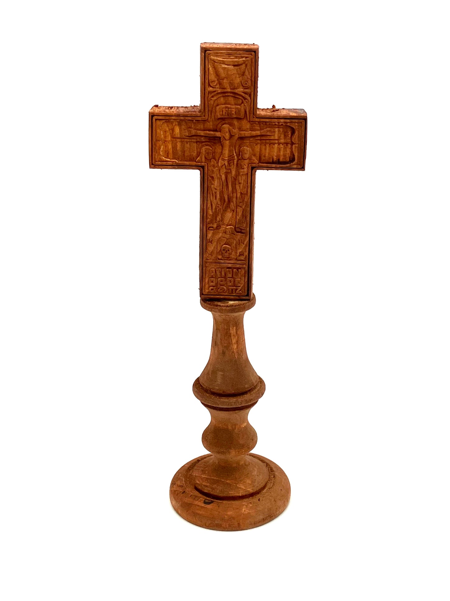 Wooden Standing Cross with Carved Icons of Crucifixion and Baptism of Christ